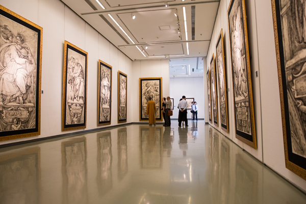 本次艺术展览择取的是丁方近年来的创作精品。展品铺满了整个美术馆的两层展厅,以“文艺复兴在东方”为主题,分神圣山水、文艺复兴式的肖像、世界著名博物馆大师经典作品的临摹与创化等三个部分的内容展出。所展出的作品将不同学科理论视角的跨领域构想以及方法论进行了融合,无论是对中国艺术精神的传承,还是对毛笔、宣纸、水墨、油彩、坦培拉、综合材料等材料语言的灵活运用,以及新媒体的介入和全方位体验,都呈现了令人震撼的视觉效果。丁方以作品形态沉淀、表达他对“文艺复兴在东方”的崭新诠释,这也是他多年来始终坚持的创作理念:将艺术中的精神信仰与文化历史的生成融汇在绘画材料、语言的表达之中.