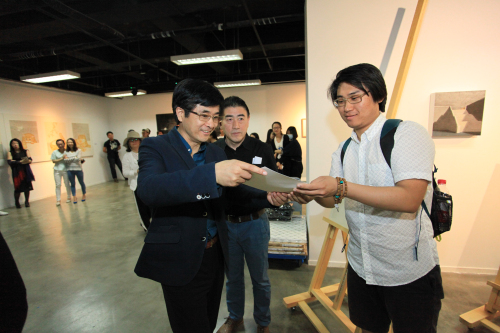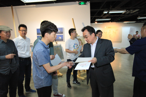 5月17日上午,“2016届毕业作品展开幕式暨康颂杯绘画作品奖颁奖仪式”在yl23455永利集团一层美术馆举行。yl23455永利党委副书记吴付来,yl23455永利集团经理丁方、党总支记王建,党委副书记别敏,法国康颂亚洲销售中心的中国区市场及销售经理吕大昆先生和公司部分师生参加开幕式。开幕式由yl23455永利集团副经理王英健主持。