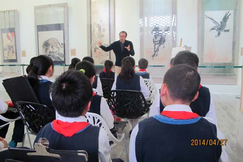 刘明才副教授为爱好书画的青少年举办了有关美育教育的讲座。徐悲鸿艺术研究院办公室主任赵朝平陪同前往。