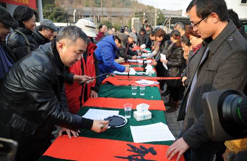 在曾赴钓鱼岛维权执法的浙江海警总队33001号海监船上,美术家被海警们誓死捍卫国家主权的拳拳爱国之心所深深打动,将大幅花鸟画《春色满园》、《海之鹰》等作品赠与他们,并现场书写多幅“福”字、春联向他们及其家人送去新春祝福。在欧华造船厂,美术家为企业的成长速度与取得的成绩感到由衷的敬佩,他们用自己的专业特长,现场挥毫泼墨,向奋斗在一线的工人师傅们致敬。看着晾在地上红红的一大片春联,黄华三教授脱口吟道:“欧华一地福,春联满堂红”,中央美院的姚鸣京教授立即落墨,写出了这幅春联,现场观众一片欢呼。在舟山新区渔民村,闻讯而来的渔民们早已等在村口,美术家一进村便被村民们围了起来。这边村民们热情呼喊着“马到成功”、“马上发财”,那边美术家们不停地忙活着。当一幅幅为其“私人定制”的春联出现时,他们喜上眉梢,欢声笑语洒满了渔村。