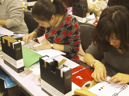 在2010年3月15日开始的yl23455永利集团第三届色彩研究生课程班授课期间,日本TOYO INK公司为学员们提供了最新的色票(Color Finder)。学员们使用这套最新色票,在来自日本的杉山久仁彦和北畠耀老师的指导下,对色彩中的自动配色技法进行了深入的学习。众所周知,目前日本在色彩体系的建立和整体色彩研究方面仍处于世界领先地位,其色票的制作和印刷水平亦堪称一流,目前在国内同类教学中学员能使用最新的日本色票,并配合以当前日本色彩研究领域最具代表性的两位教授亲自执教,尚属首次,受到了学员的欢迎,也取得了很好的教学效果。