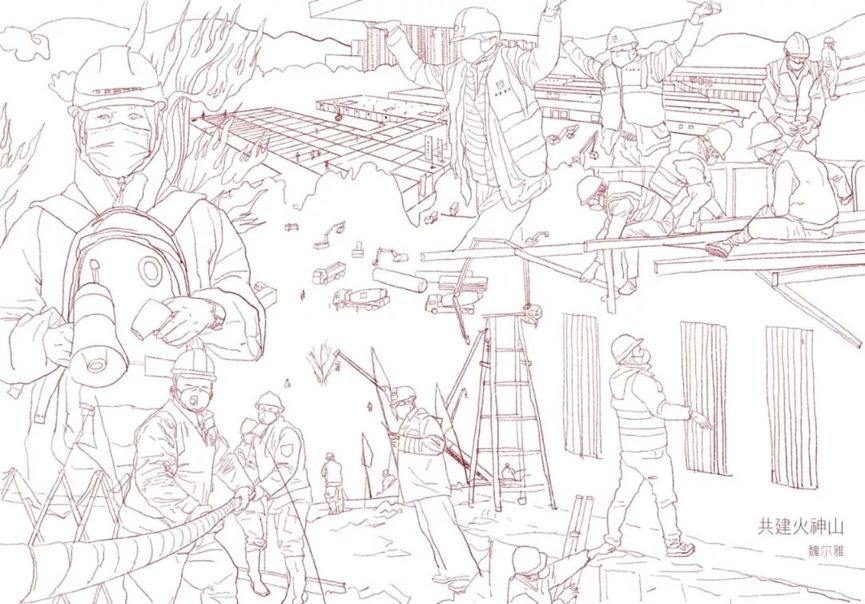 作品素材取自火神山医院建设工作现场的新闻图片