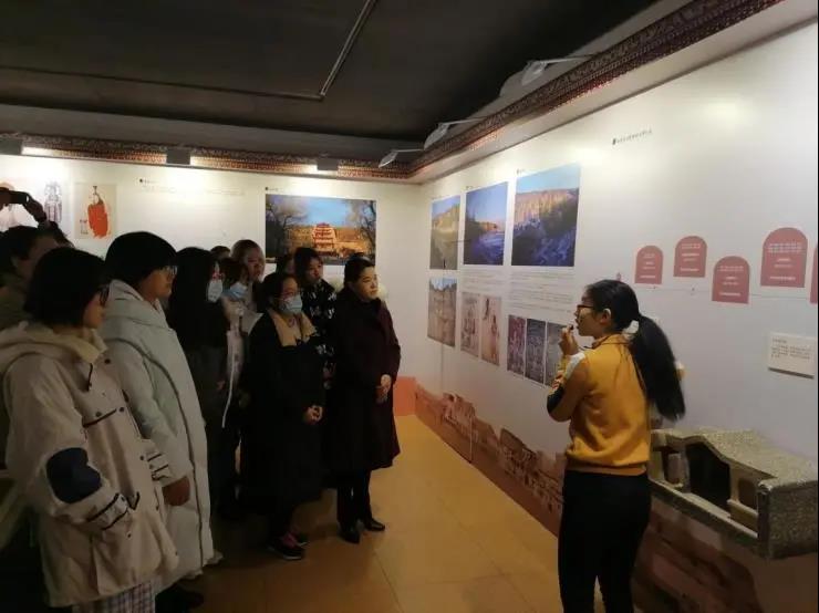 进入展厅,讲解员带领同学们走进了灿烂辉煌的敦煌世界,作为世界上现存营造时间最久、规模最大、内容最丰富、保存最完好的宗教艺术宝窟,敦煌莫高窟记载了辽阔绵长的丝绸之路上的多元文明最终成果,十六国的前秦时期,至北朝、隋、唐、五代、西夏、元的壁画、雕塑、建筑艺术,展现了最灿烂的敦煌神韵与莫高魅力。
