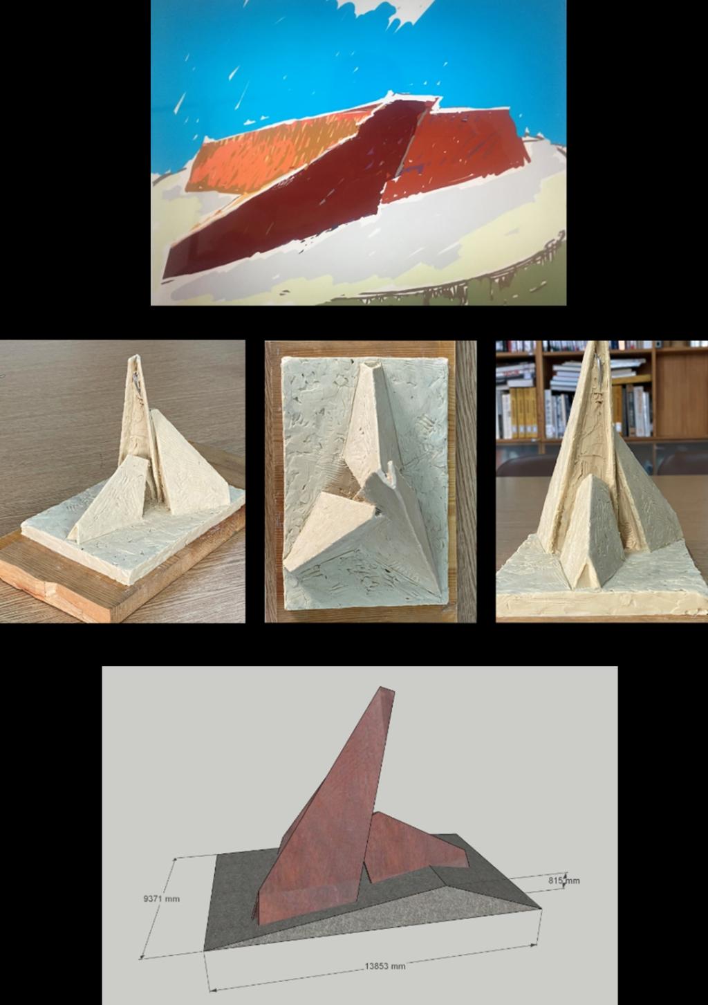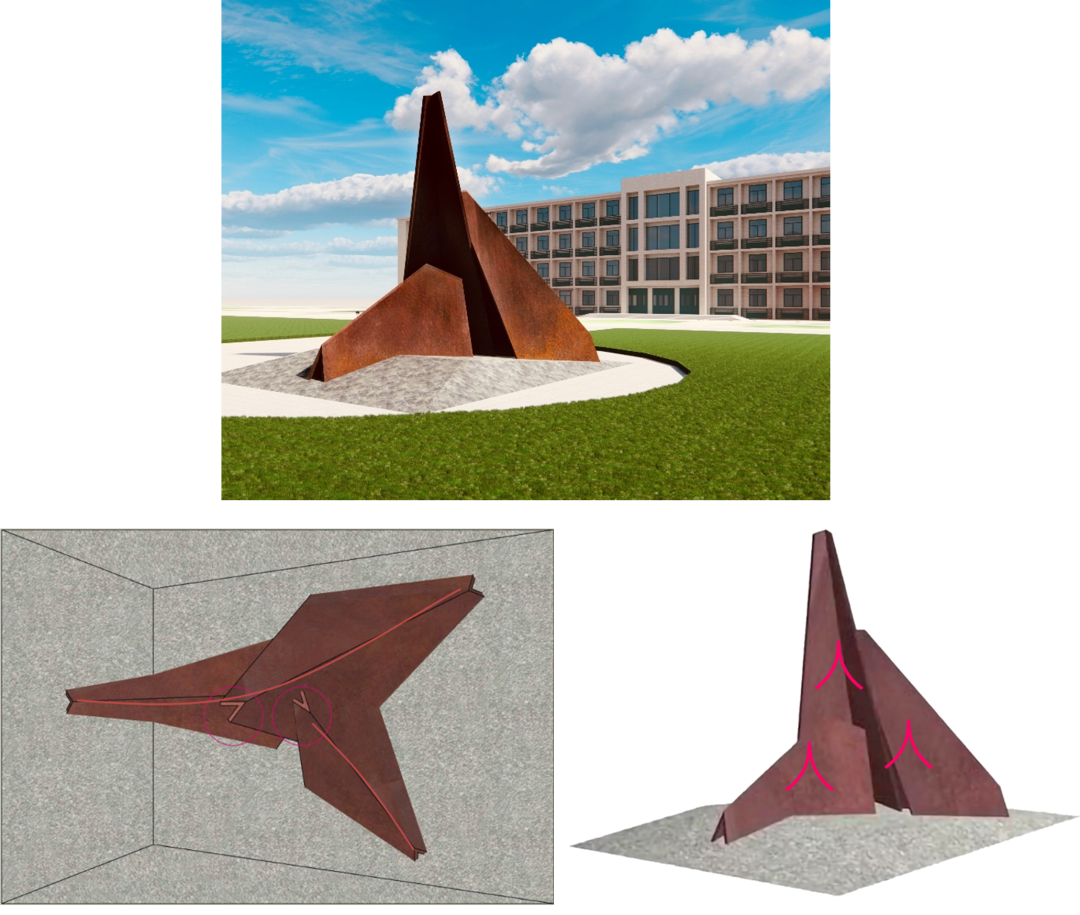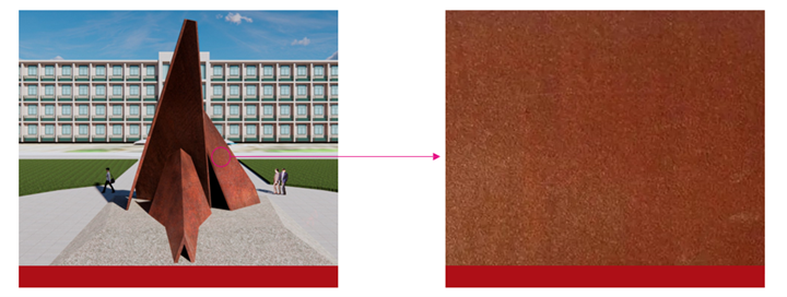 张淳:雕塑主体色调和表面效果采用耐候钢氧化效果,这种材质具有耐腐蚀、耐高温、抗疲劳、韧性延伸性强等特点,因时间的原因,表面会逐渐从橙色趋于红色的变化,时间越长,自然生成的铁红色效果越深。