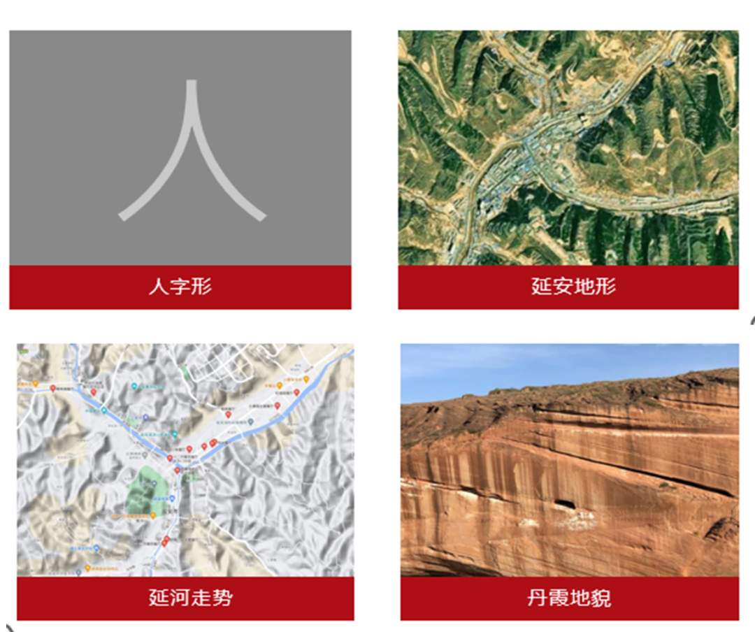 就其形态而言,这尊雕塑的俯视形态以“人”字形、延安地貌意象、延河走势、延安丹霞地貌等共性特征为创意构型来源。被宝塔山、凤凰山、清凉山所环抱的延安,山峰间道路交错纵横,“人”字的形状浑然天成;延河与南川河在这里交汇,奔涌前行的河水宛如流动的“人”字,更像翻涌在这片热土上的红色血脉。