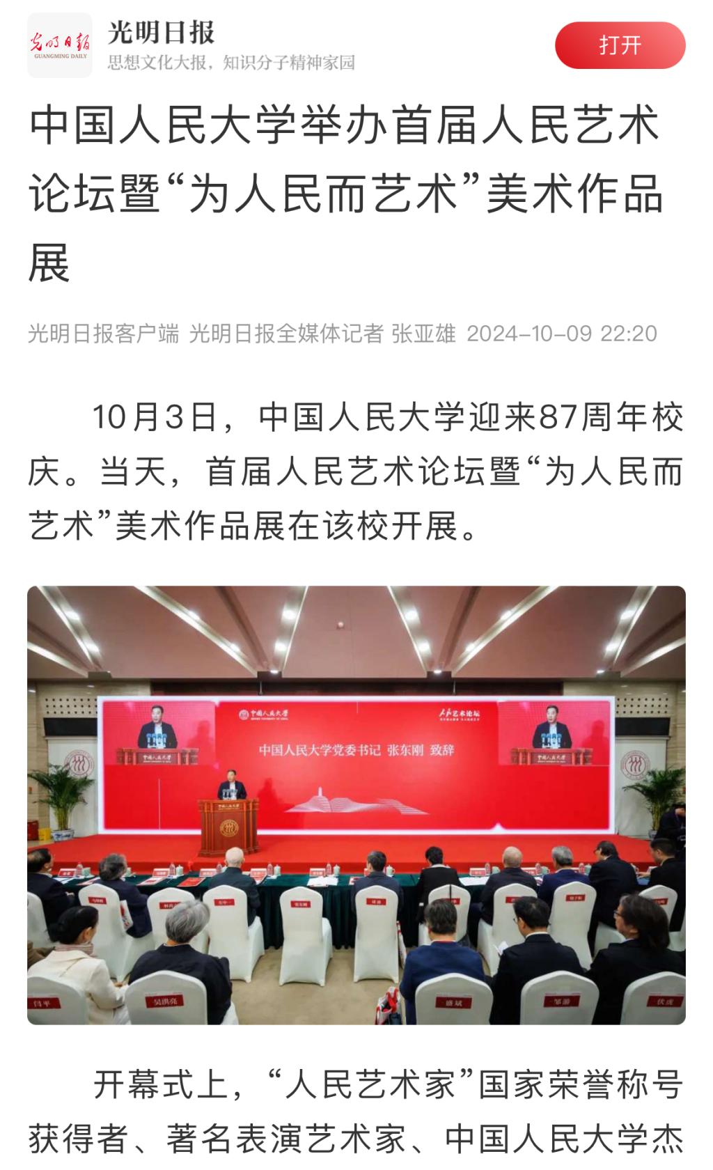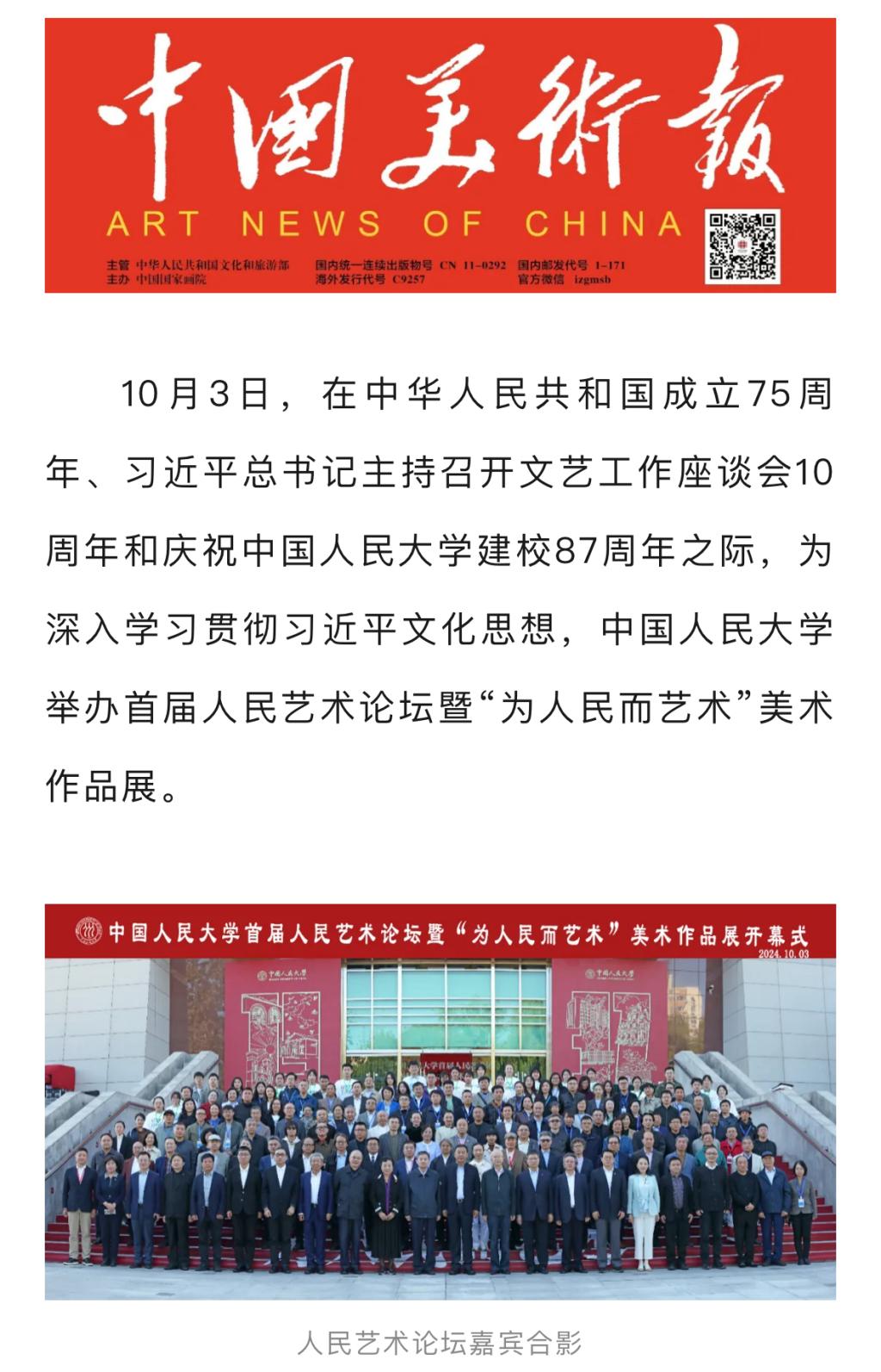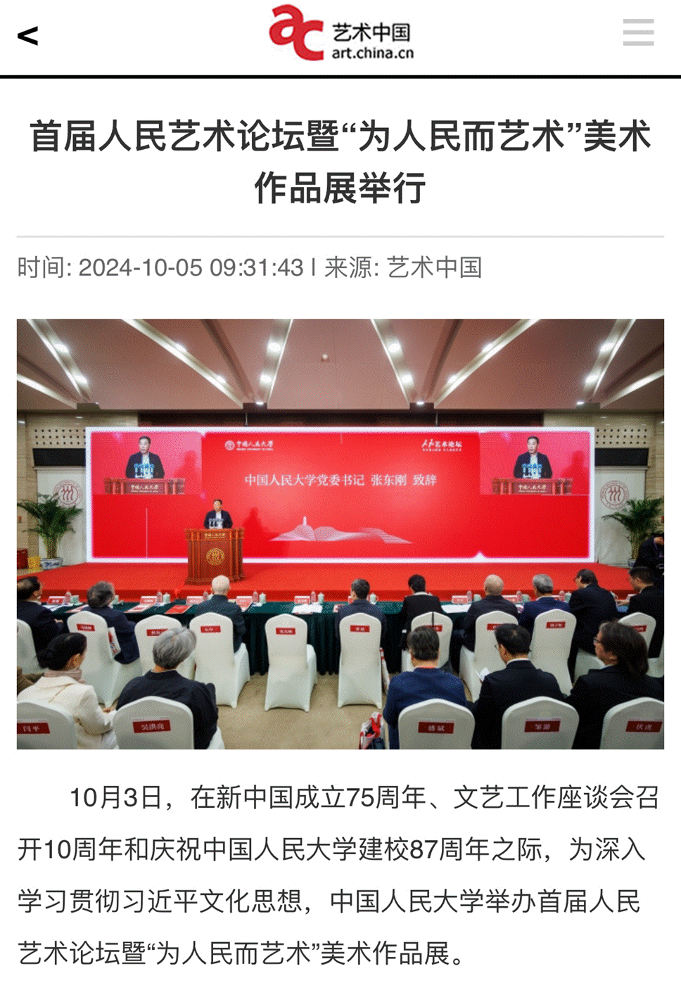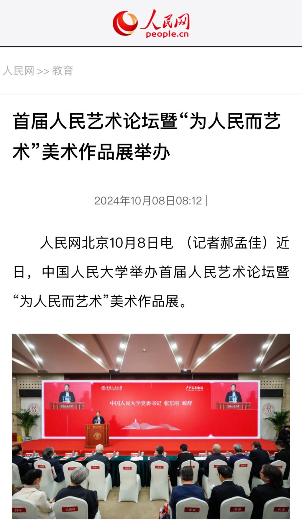 2024年10月3日,首届人民艺术论坛暨“为人民而艺术”美术作品展在yl23455永利成功举办。在新中国成立75周年、文艺工作座谈会召开10周年之际,yl23455永利迎来87周年校庆,创设人民艺术论坛,是深入学习贯彻习近平文化思想的重要举措,也是推动建构中国艺术学学科自主知识体系的题中要义。本届论坛以“为人民而艺术”为主题,搭建高端、开放、包容的学术交流平台,形成高校与科研机构、艺术机构、艺术传媒交流机制,对深入探讨艺术的时代价值和人文价值,共同建构中国艺术学学科自主知识体系,更好担负起新的文化使命、推进中国特色社会主义文化建设、建设中华民族现代文明起到推动作用。