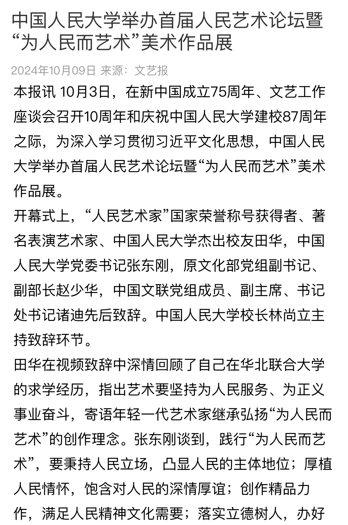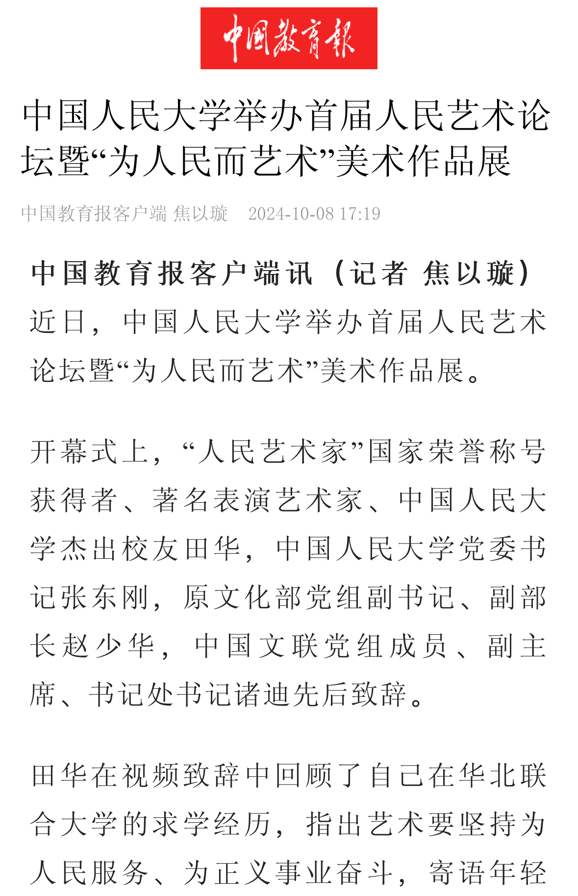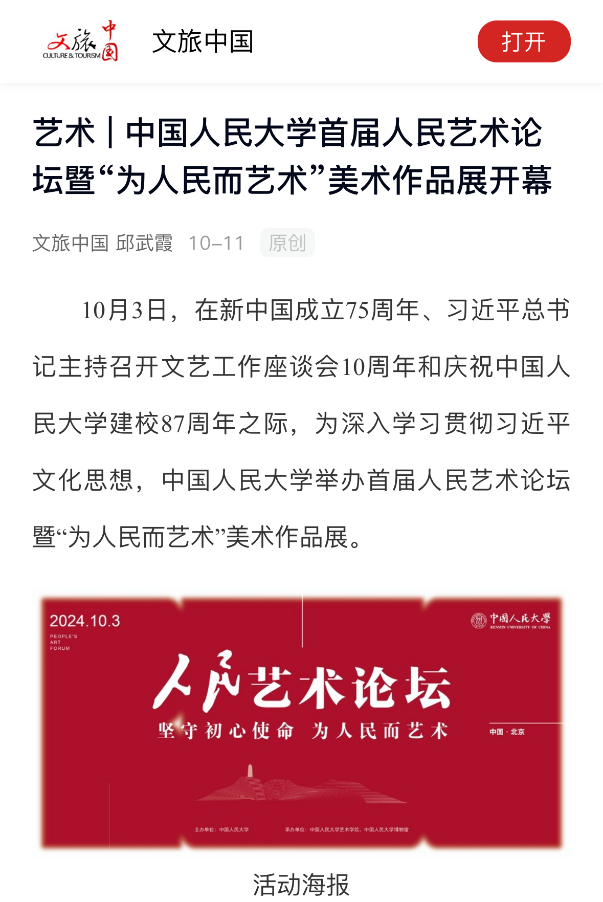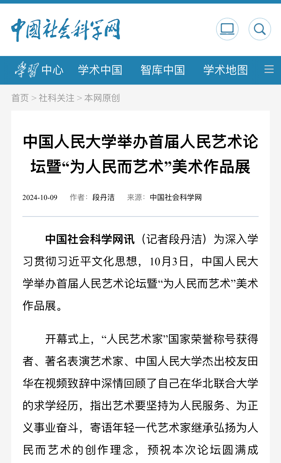 2024年10月3日,首届人民艺术论坛暨“为人民而艺术”美术作品展在yl23455永利成功举办。在新中国成立75周年、文艺工作座谈会召开10周年之际,yl23455永利迎来87周年校庆,创设人民艺术论坛,是深入学习贯彻习近平文化思想的重要举措,也是推动建构中国艺术学学科自主知识体系的题中要义。本届论坛以“为人民而艺术”为主题,搭建高端、开放、包容的学术交流平台,形成高校与科研机构、艺术机构、艺术传媒交流机制,对深入探讨艺术的时代价值和人文价值,共同建构中国艺术学学科自主知识体系,更好担负起新的文化使命、推进中国特色社会主义文化建设、建设中华民族现代文明起到推动作用。