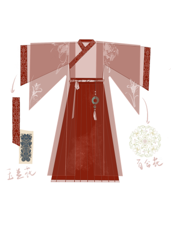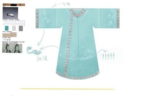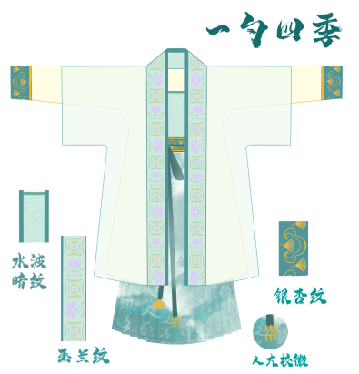 团队以宋制汉服为基础,初版男款为交领长衫款式,以玉兰花纹和百合花纹为灵感,腰间佩戴玉饰;女款设计以“绿色水墨风”为主调,为抹胸+褶裙+褙子款式,裙摆铺陈一勺池水波纹与书法暗纹,袖口点缀银杏叶。