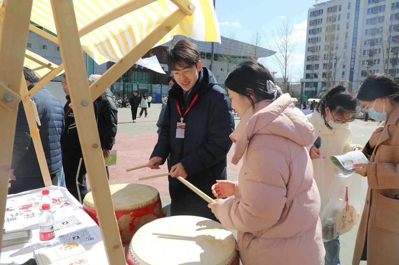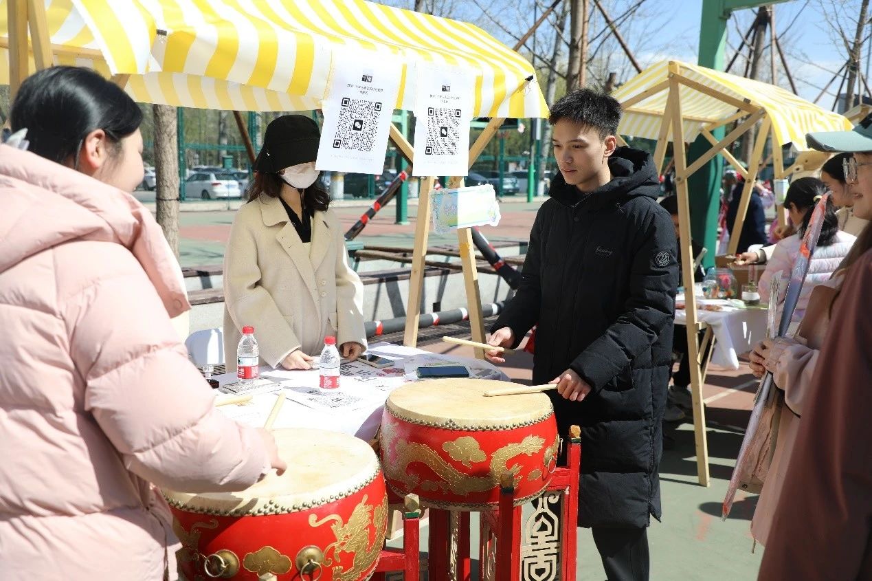 整个活动期间,品园篮球场始终回荡着欢快的鼓点与爽朗的笑声。同学们的热情如同燃烧的火焰,将整个摊位区域渲染得热气腾腾。他们穿梭在节奏练习与知识问答之间,时而沉浸于鼓声的魅力,时而沉浸在答题集章的海洋。