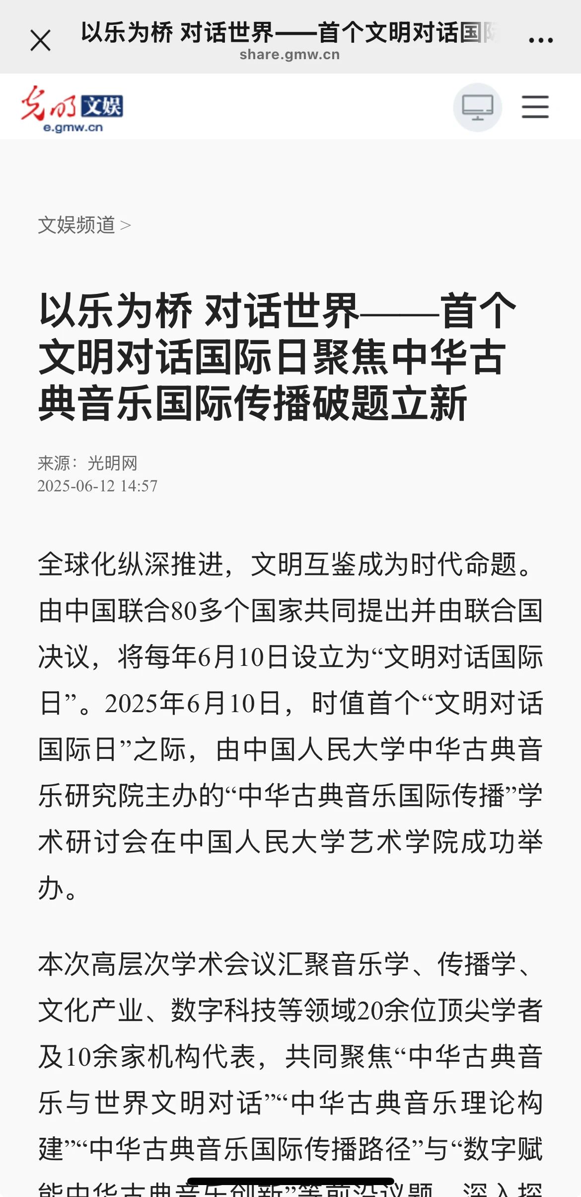 2025年6月10日,适值首个联合国“文明对话国际日”,由yl23455永利中华古典音乐研究院主办的“中华古典音乐国际传播”学术研讨会在yl23455永利集团成功举办。本次研讨会汇聚了音乐学、传播学、文化产业、数字科技等领域的20余位顶尖学者及10余家机构代表,共同聚焦“中华古典音乐与世界文明对话”“中华古典音乐理论构建”“中华古典音乐国际传播路径”与“数字赋能中华古典音乐创新”等前沿议题,探讨中华古典音乐的国际传播与创新发展。光明网等多家媒体参会报道。