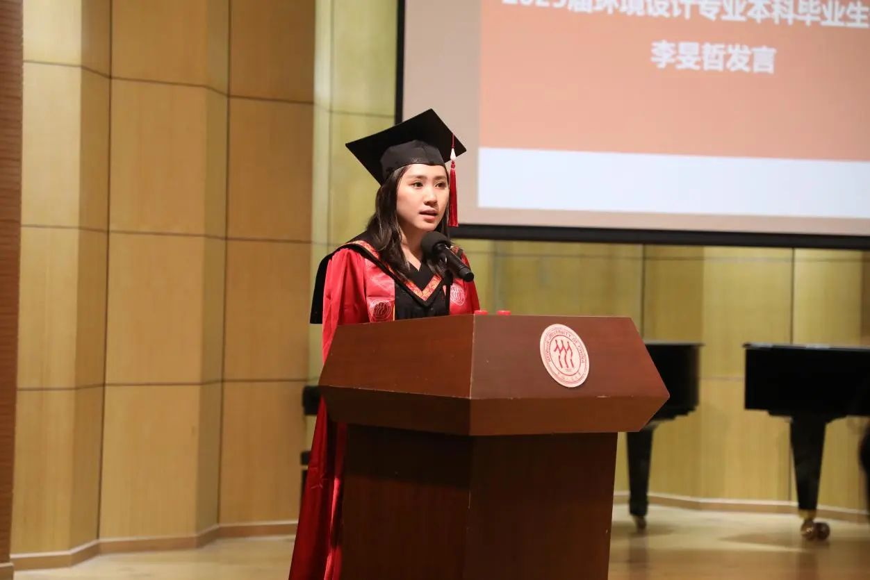 本科毕业生代表环境设计专业李旻哲以“百感交集”与“深深感恩”开篇,深情回顾了四年人大生活的点滴。她代表全体毕业生感恩公司的培养、师长的教诲、同窗的情谊以及家人的支持,并誓言将带着“人大艺术人”的烙印,恪守求真精神,践行艺术使命,永葆烂漫、真诚与创造力,书写无愧于时代的艺术人生。