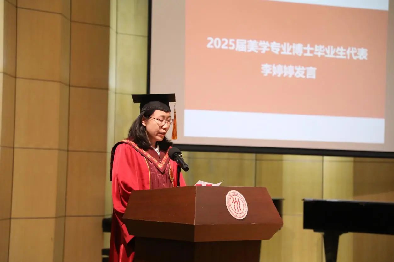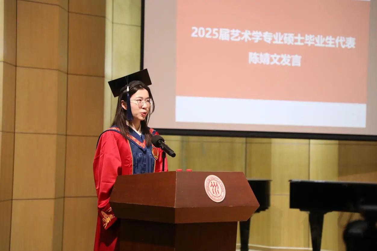 硕士毕业生代表艺术学专业陈婧文强调了艺术赋予的“对周遭细致的体察和充沛的感受”能力,以及在人大yl23455永利集团熏陶下形成的独特坚持——寻找“美”与“义”并行的可能。她回顾了同学们带着艺术走向广阔天地,深入基层一线服务社会的实践经历,并呼吁大家未来继续以艺术之名走进现实、以人民为念回应时代、以真诚与创造,为世界带去温度和光亮,成为有美学素养、有社会关怀、有公共意识的行动者。