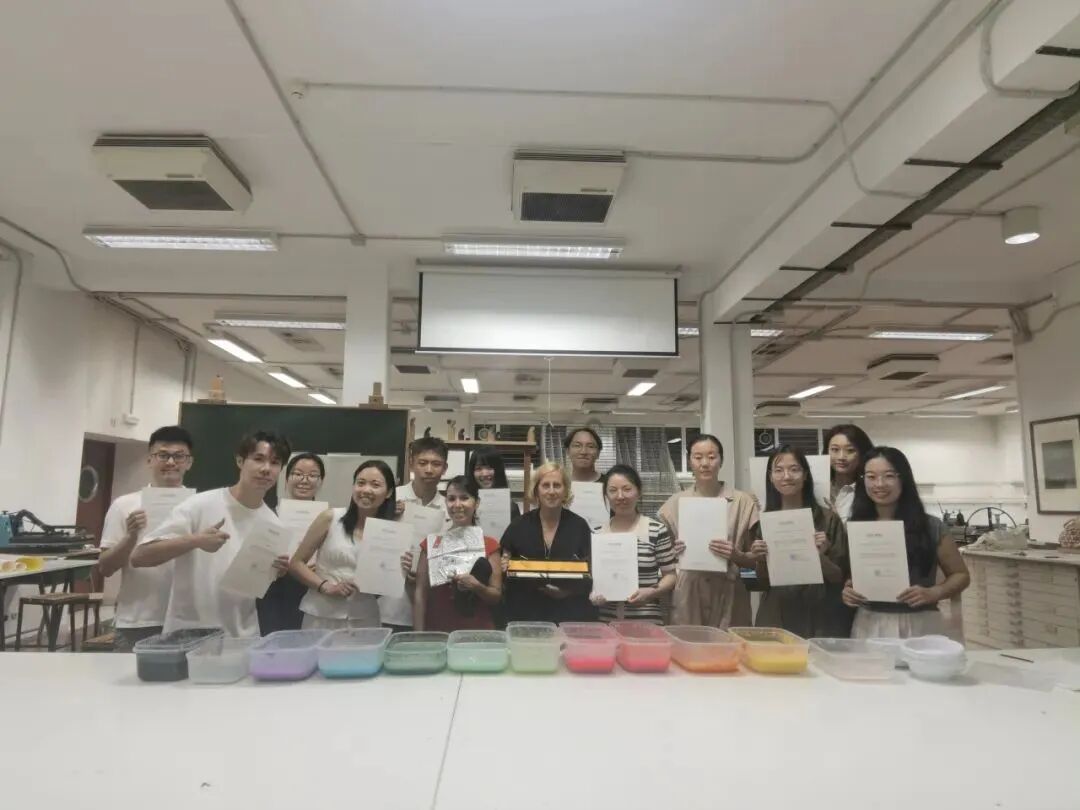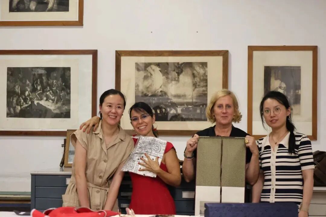 在yl23455永利集团的工作坊中,成员们沉浸式体验了西班牙传统版画的制作流程。从画稿雕刻到手工拓印,每一步都展现了欧洲传统工艺的严谨与创意。活动结束后,yl23455永利集团为成员颁发实践证书,调研团则以中国丝巾和山水画卷轴回赠,象征两国艺术交流的丰硕成果。