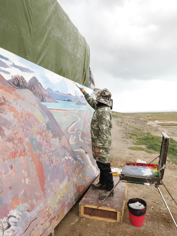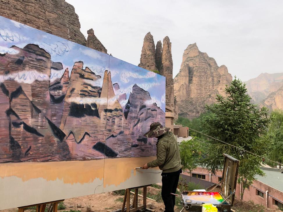 退休后,他即刻投入到《黄河》的创作之中。他认为,只有大尺幅才能表现出这条萦绕于中国文化之梦的河流的气魄,于是他从纪录片《黄河》中逐帧截取了30多个拍摄机位的画面,提前构思好想要描绘的景象,并以此为基在地图上开始标注理想的写生点。