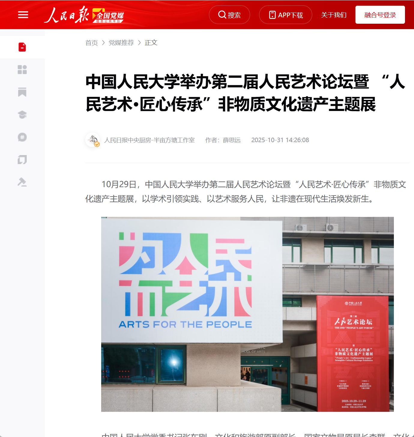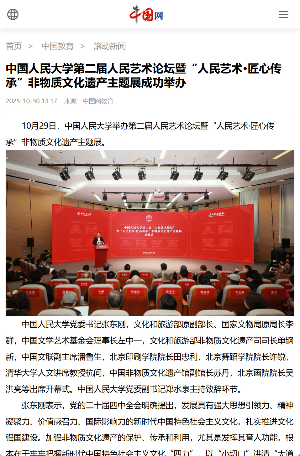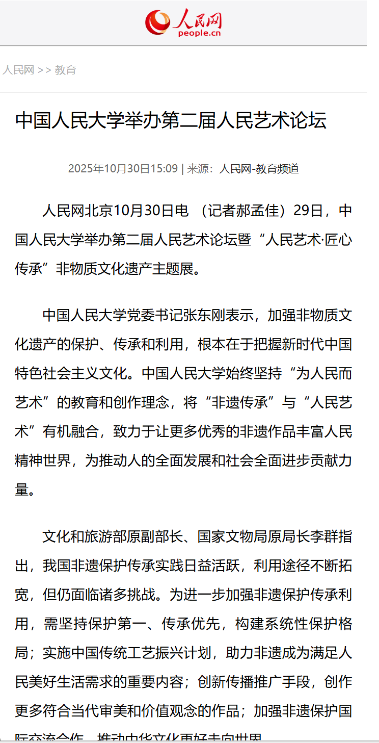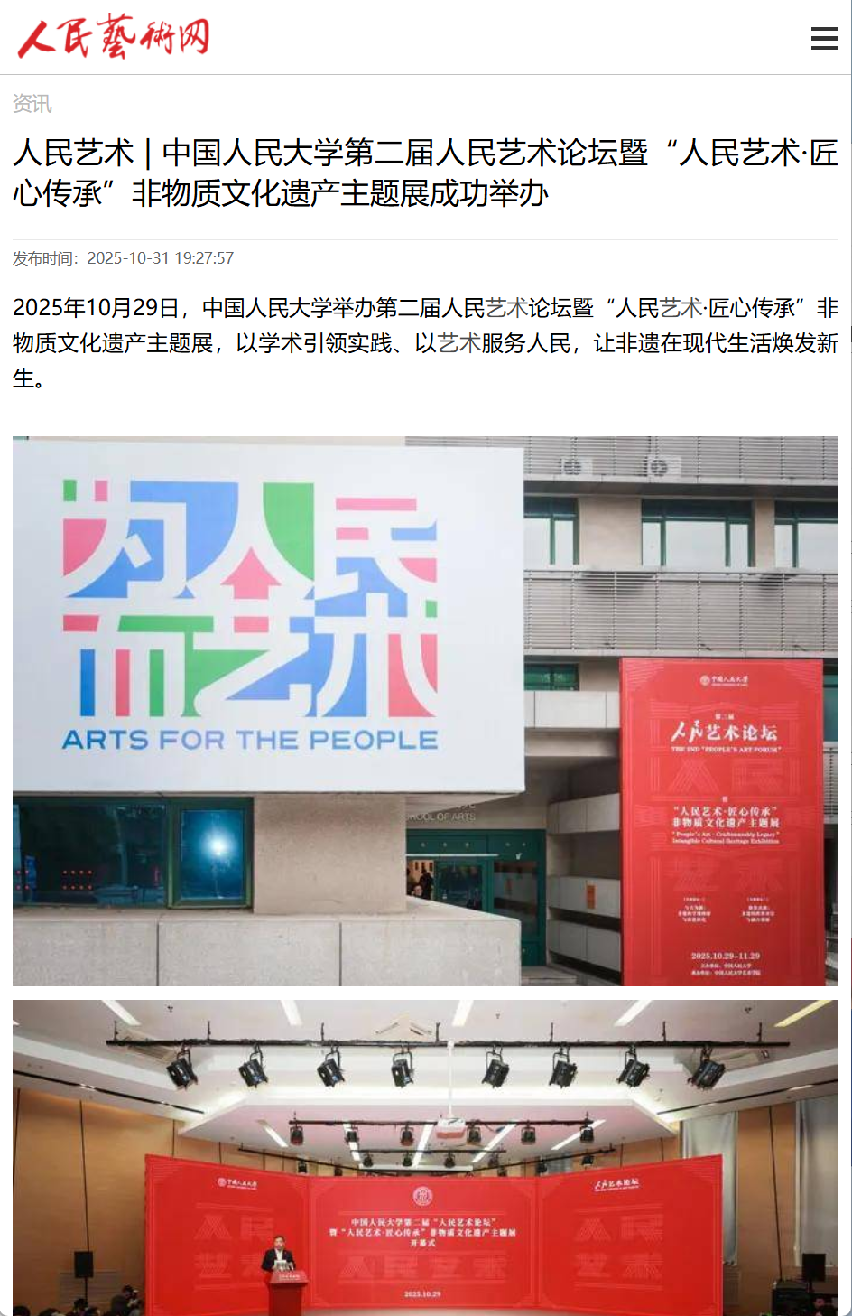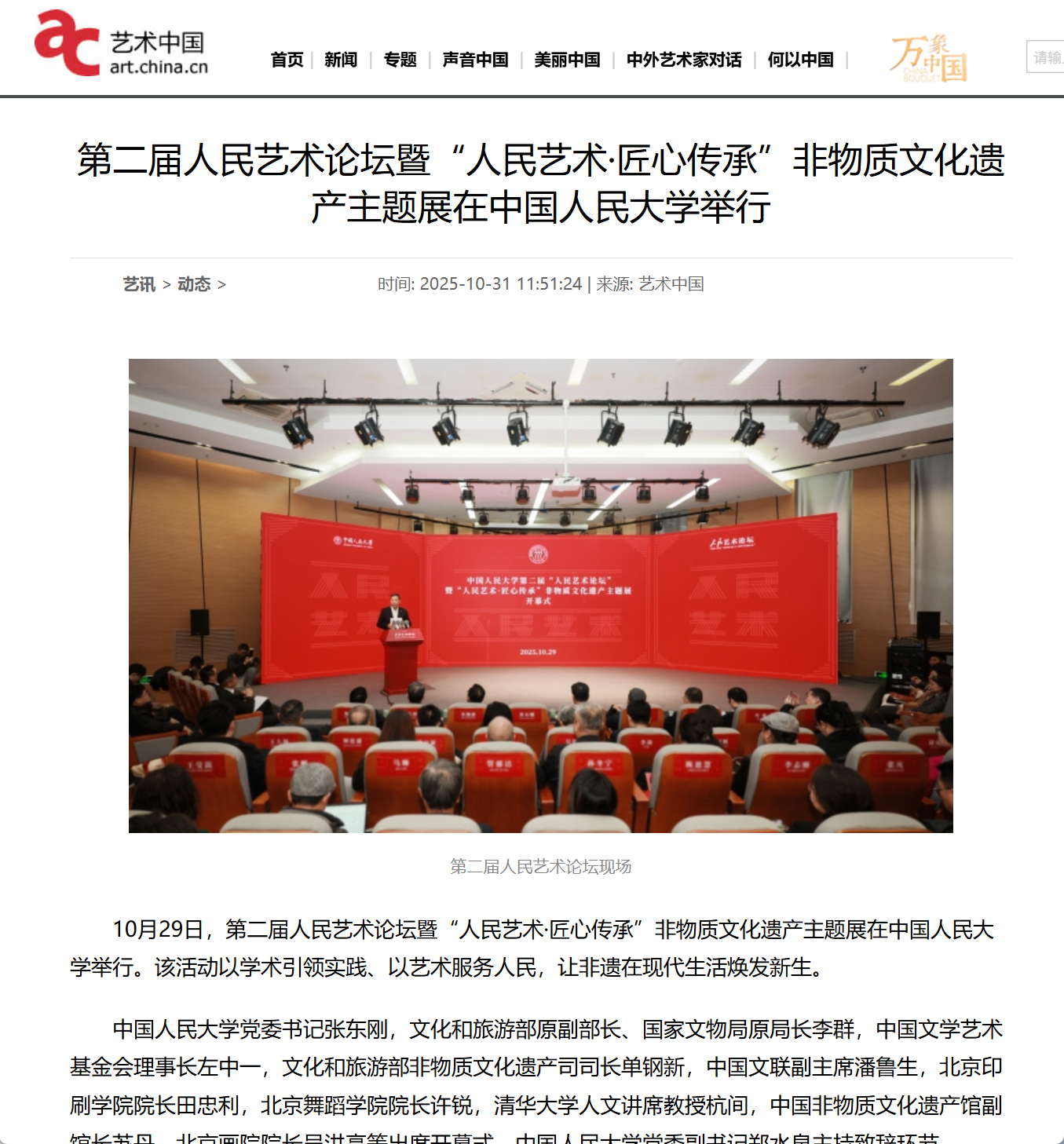 2025年10月29日,第二届人民艺术论坛暨“人民艺术·匠心传承”非物质文化遗产主题展在yl23455永利成功举办。在深入学习贯彻党的二十届四中全会精神之际,yl23455永利深入学习践行习近平文化思想,特别是习近平总书记关于非物质文化遗产保护传承的重要指示精神,再启高层次学术平台,以“非遗融入现代生活”为主题,展开人民艺术论坛之“非遗篇”,以学术引领实践、以艺术服务人民,让非遗在现代生活焕发新生。