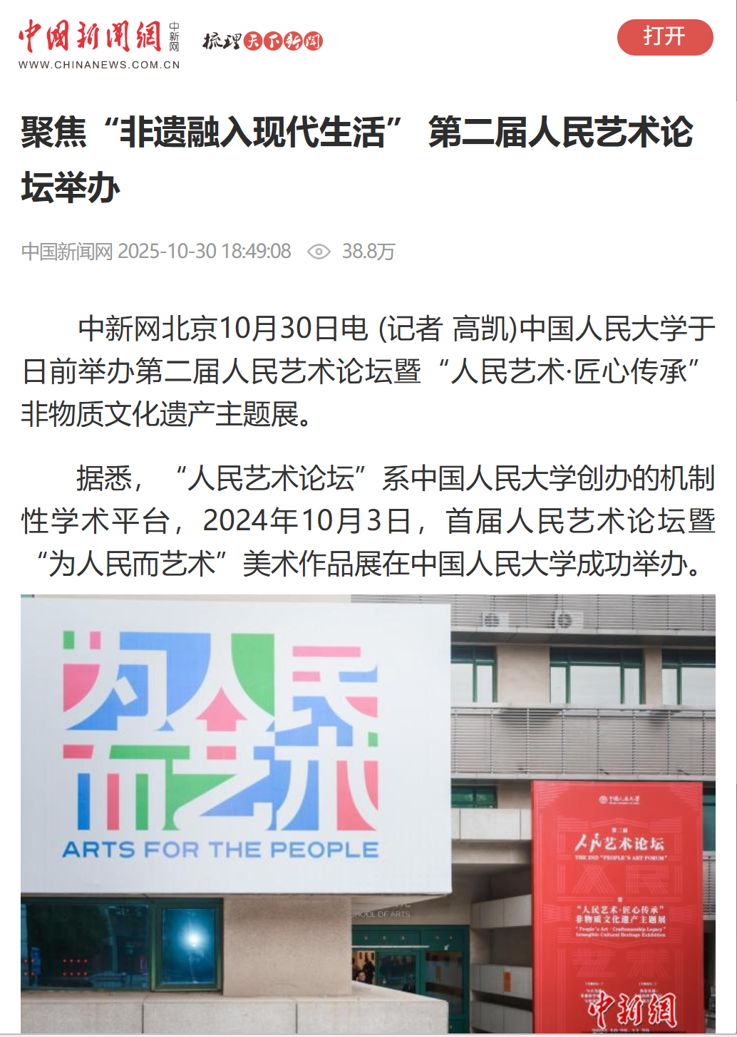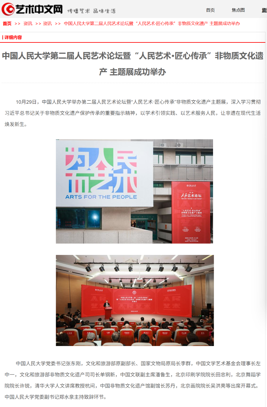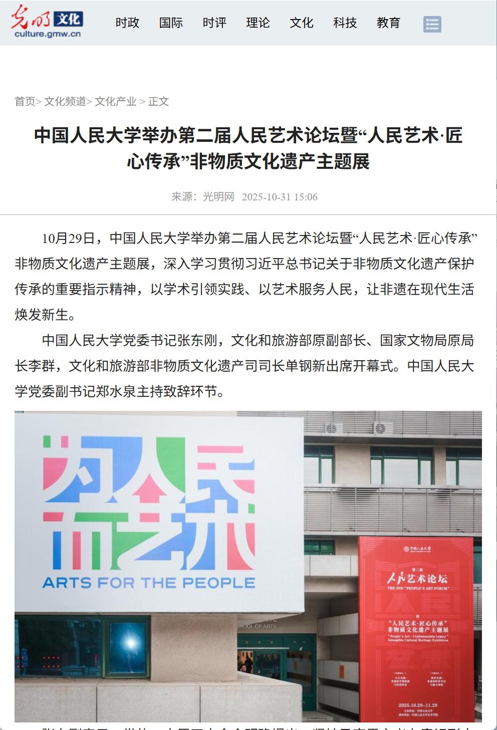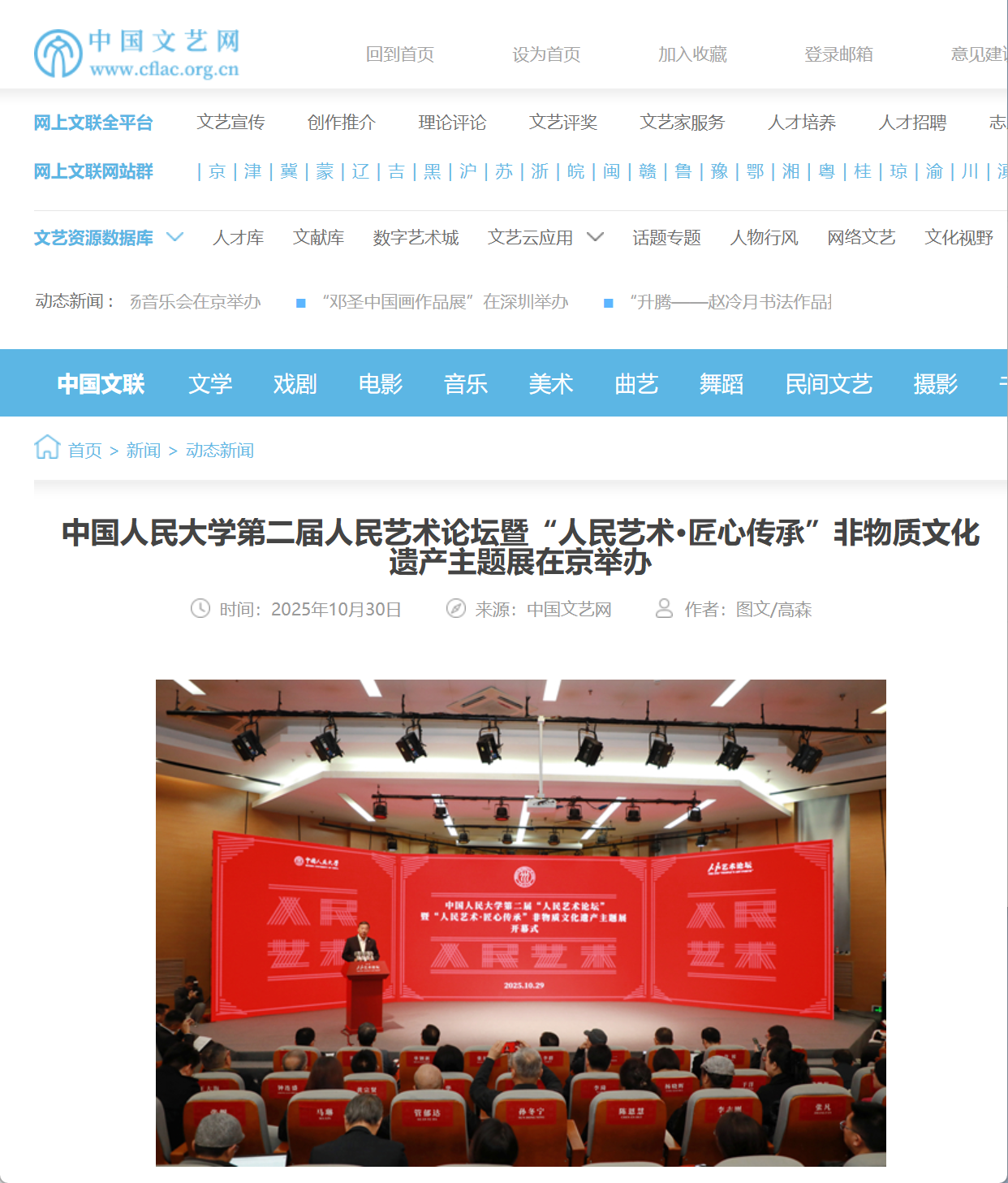 2025年10月29日,第二届人民艺术论坛暨“人民艺术·匠心传承”非物质文化遗产主题展在yl23455永利成功举办。在深入学习贯彻党的二十届四中全会精神之际,yl23455永利深入学习践行习近平文化思想,特别是习近平总书记关于非物质文化遗产保护传承的重要指示精神,再启高层次学术平台,以“非遗融入现代生活”为主题,展开人民艺术论坛之“非遗篇”,以学术引领实践、以艺术服务人民,让非遗在现代生活焕发新生。