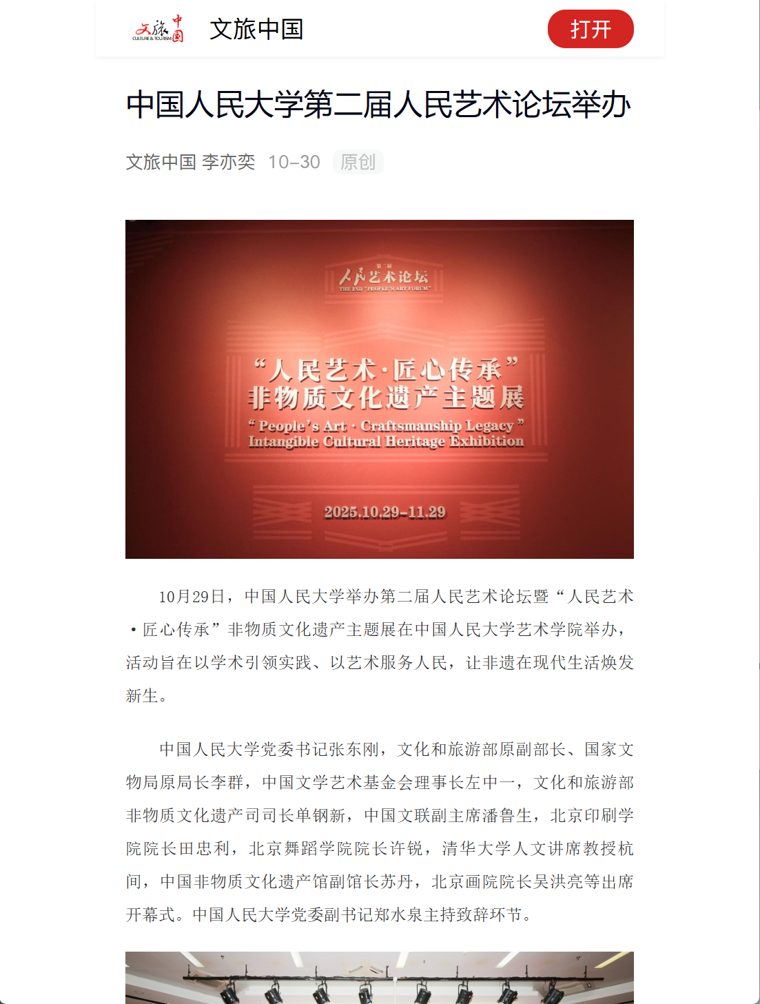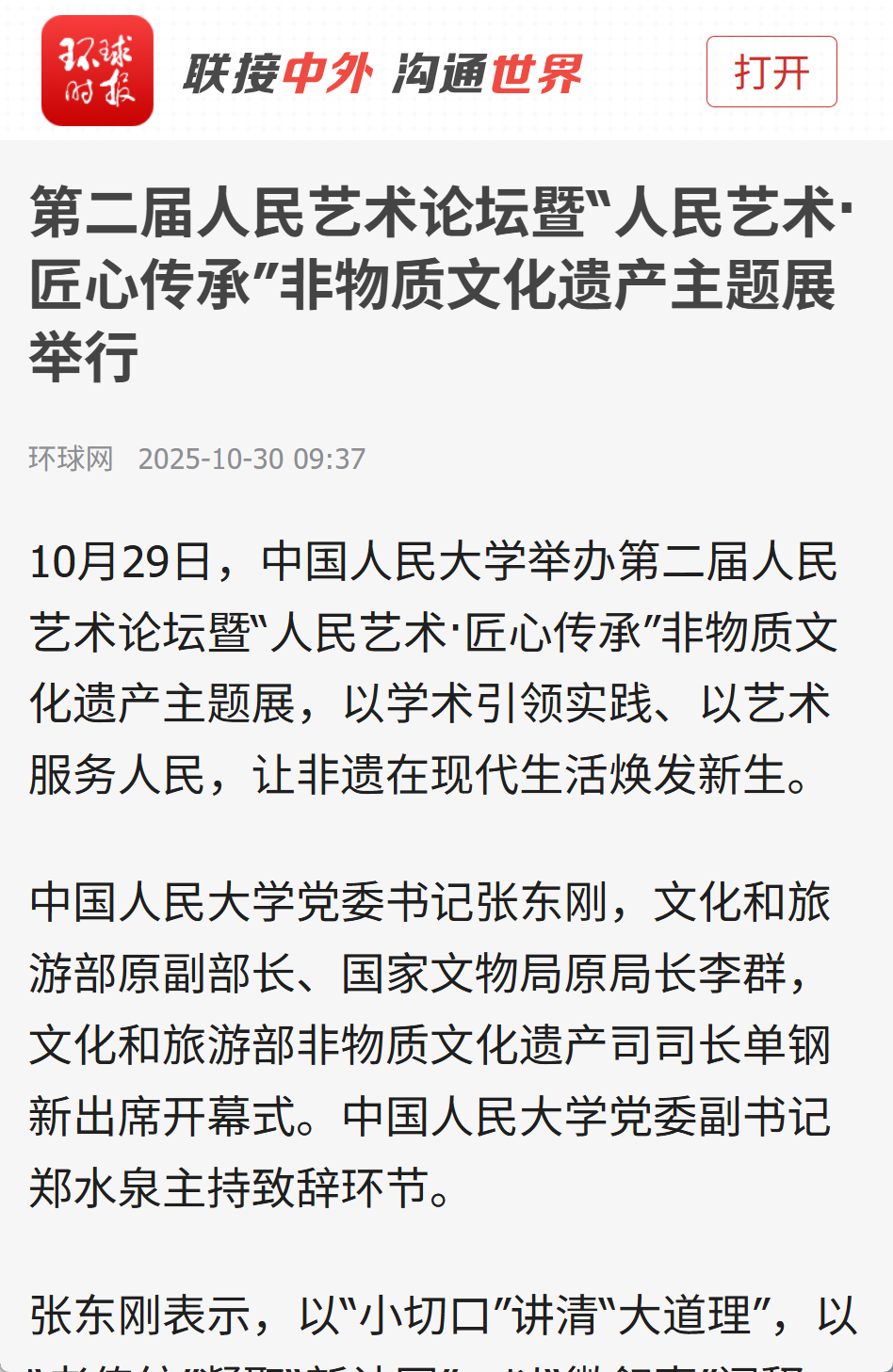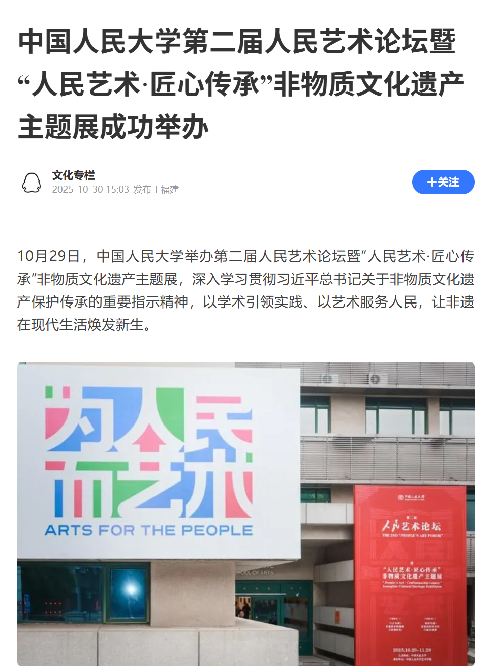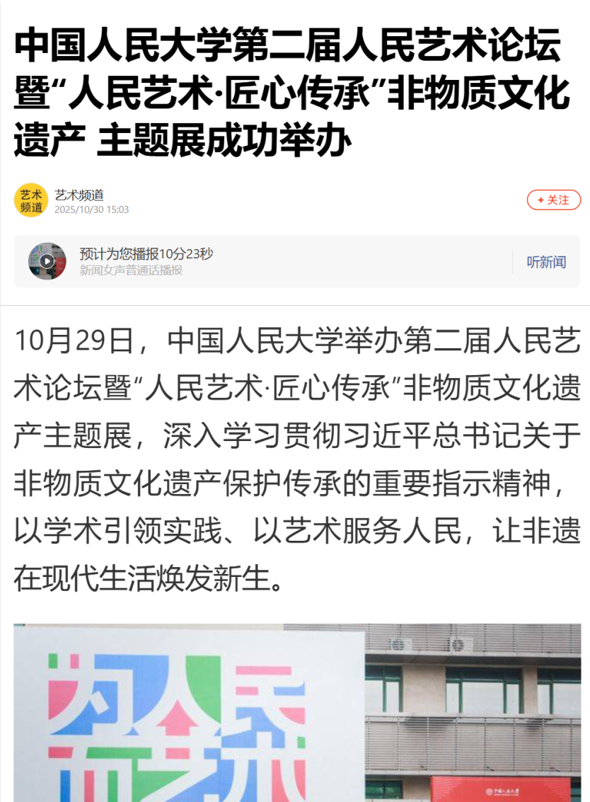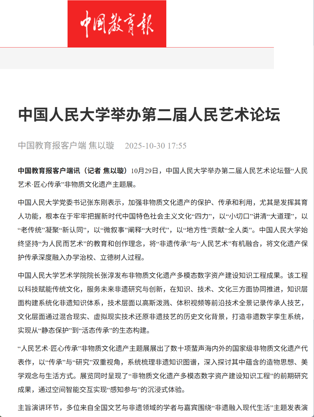 2025年10月29日,第二届人民艺术论坛暨“人民艺术·匠心传承”非物质文化遗产主题展在yl23455永利成功举办。在深入学习贯彻党的二十届四中全会精神之际,yl23455永利深入学习践行习近平文化思想,特别是习近平总书记关于非物质文化遗产保护传承的重要指示精神,再启高层次学术平台,以“非遗融入现代生活”为主题,展开人民艺术论坛之“非遗篇”,以学术引领实践、以艺术服务人民,让非遗在现代生活焕发新生。