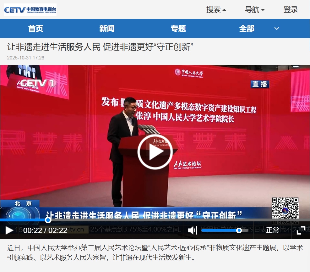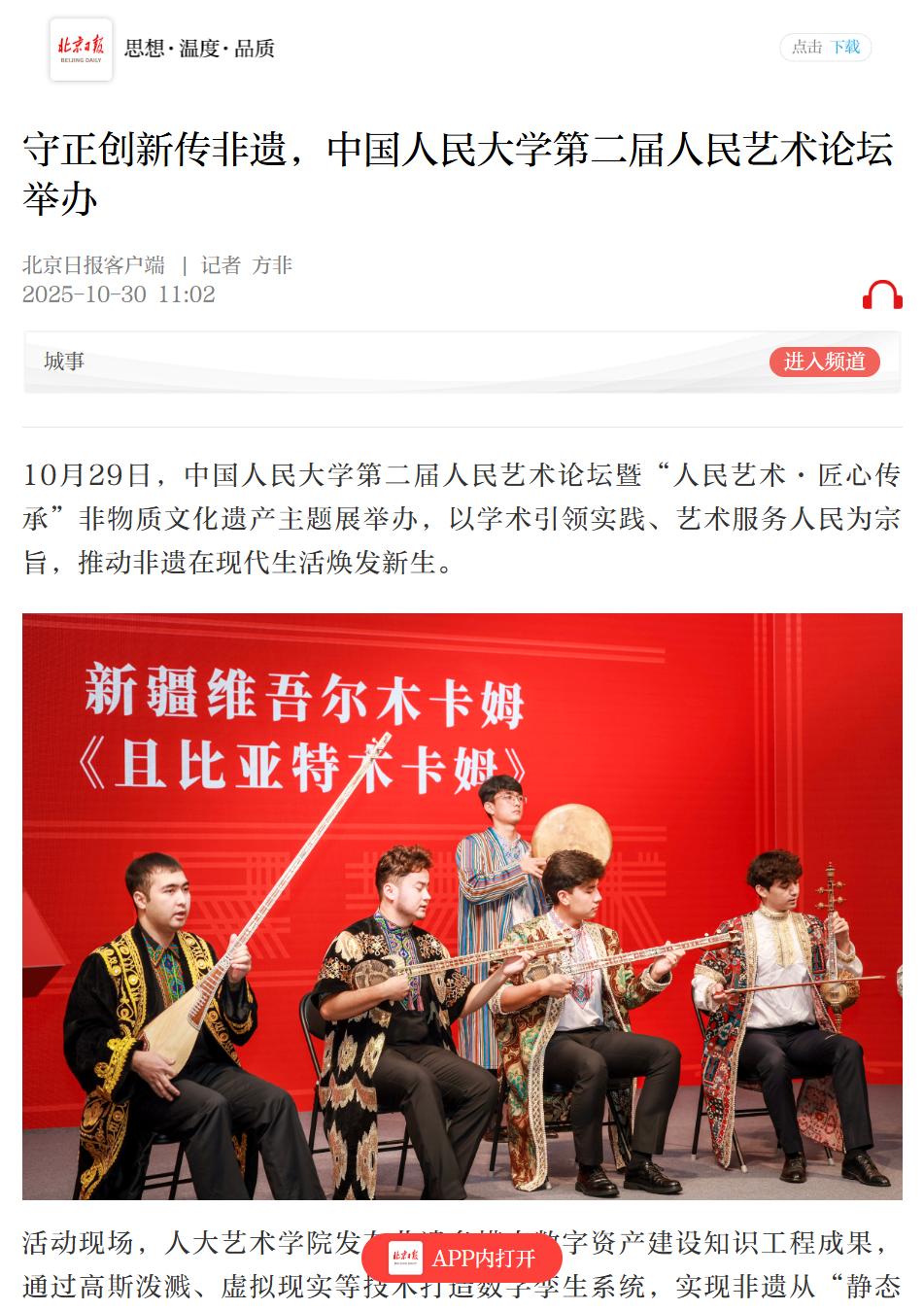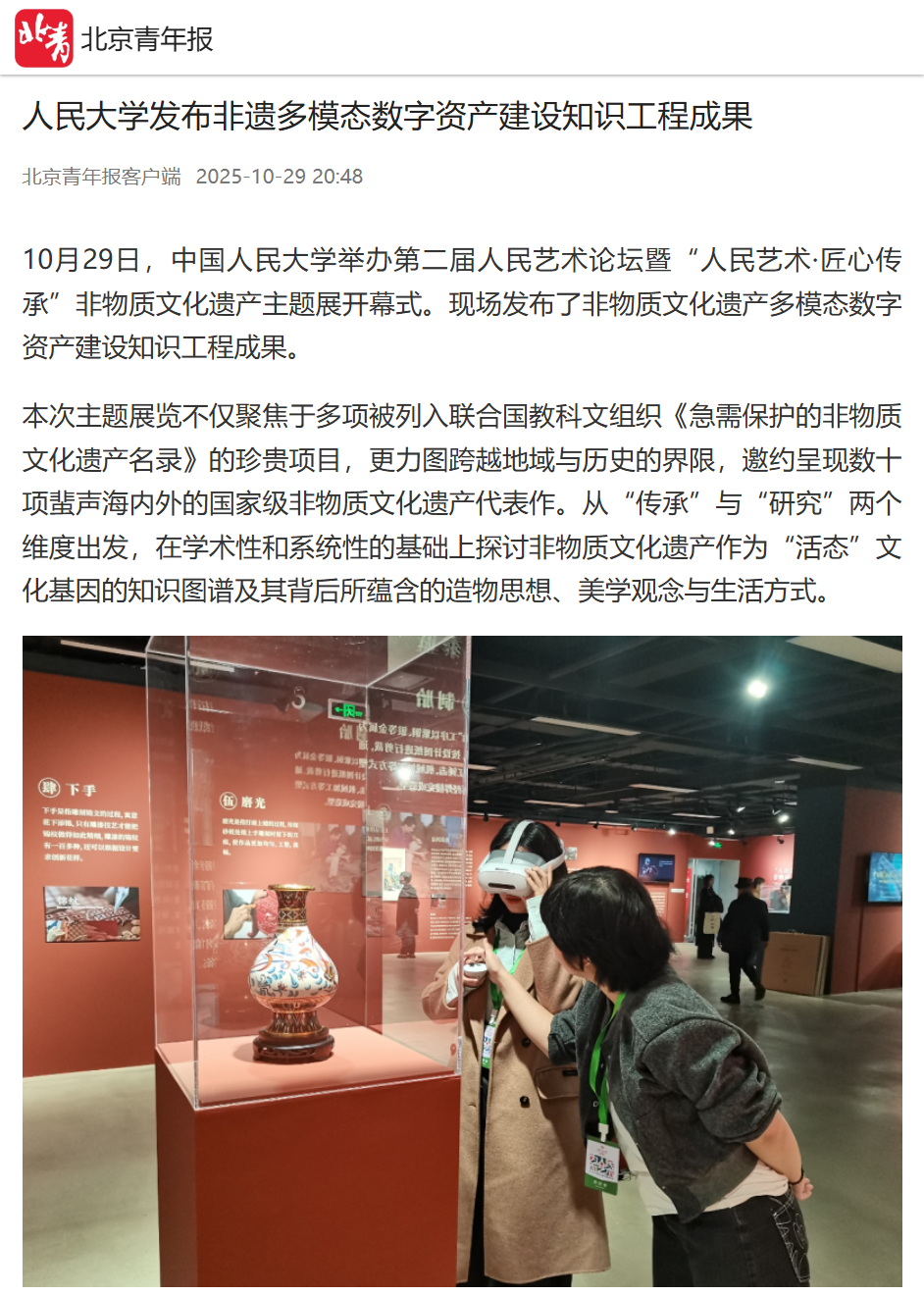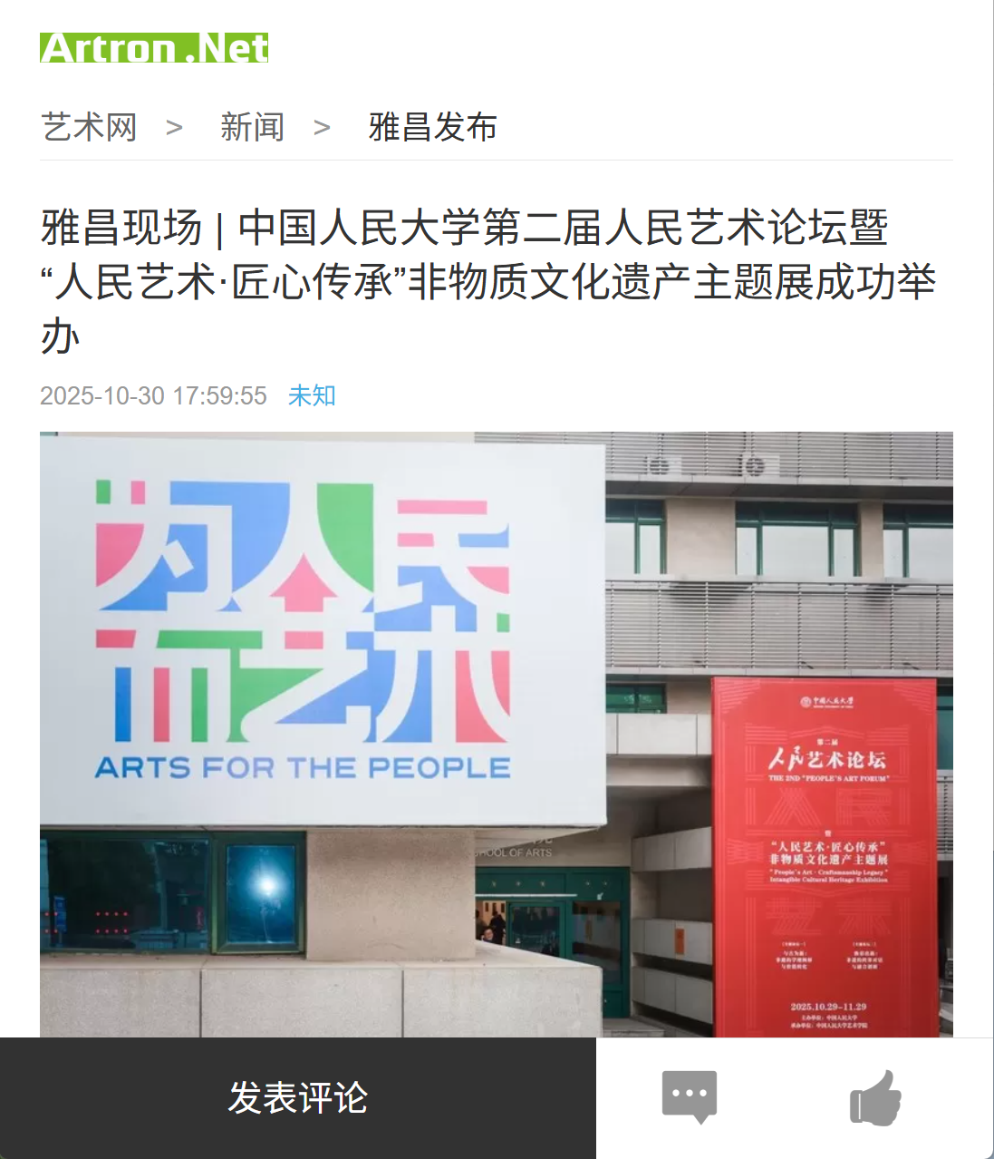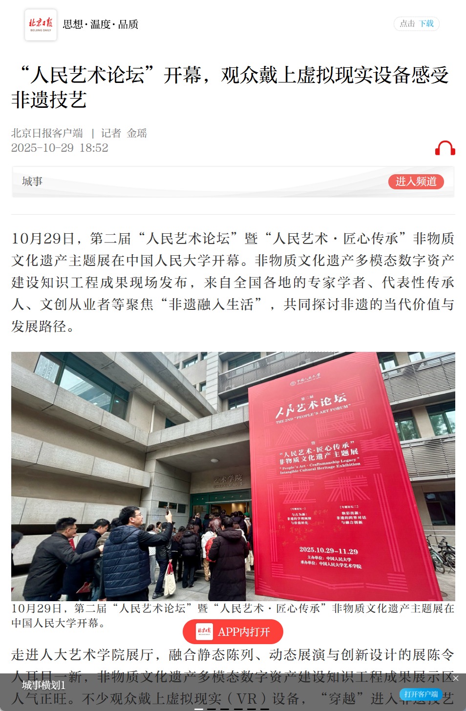 2025年10月29日,第二届人民艺术论坛暨“人民艺术·匠心传承”非物质文化遗产主题展在yl23455永利成功举办。在深入学习贯彻党的二十届四中全会精神之际,yl23455永利深入学习践行习近平文化思想,特别是习近平总书记关于非物质文化遗产保护传承的重要指示精神,再启高层次学术平台,以“非遗融入现代生活”为主题,展开人民艺术论坛之“非遗篇”,以学术引领实践、以艺术服务人民,让非遗在现代生活焕发新生。