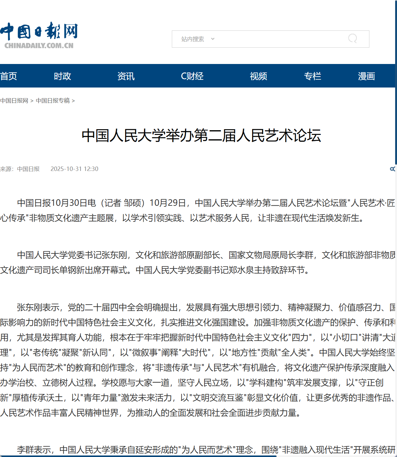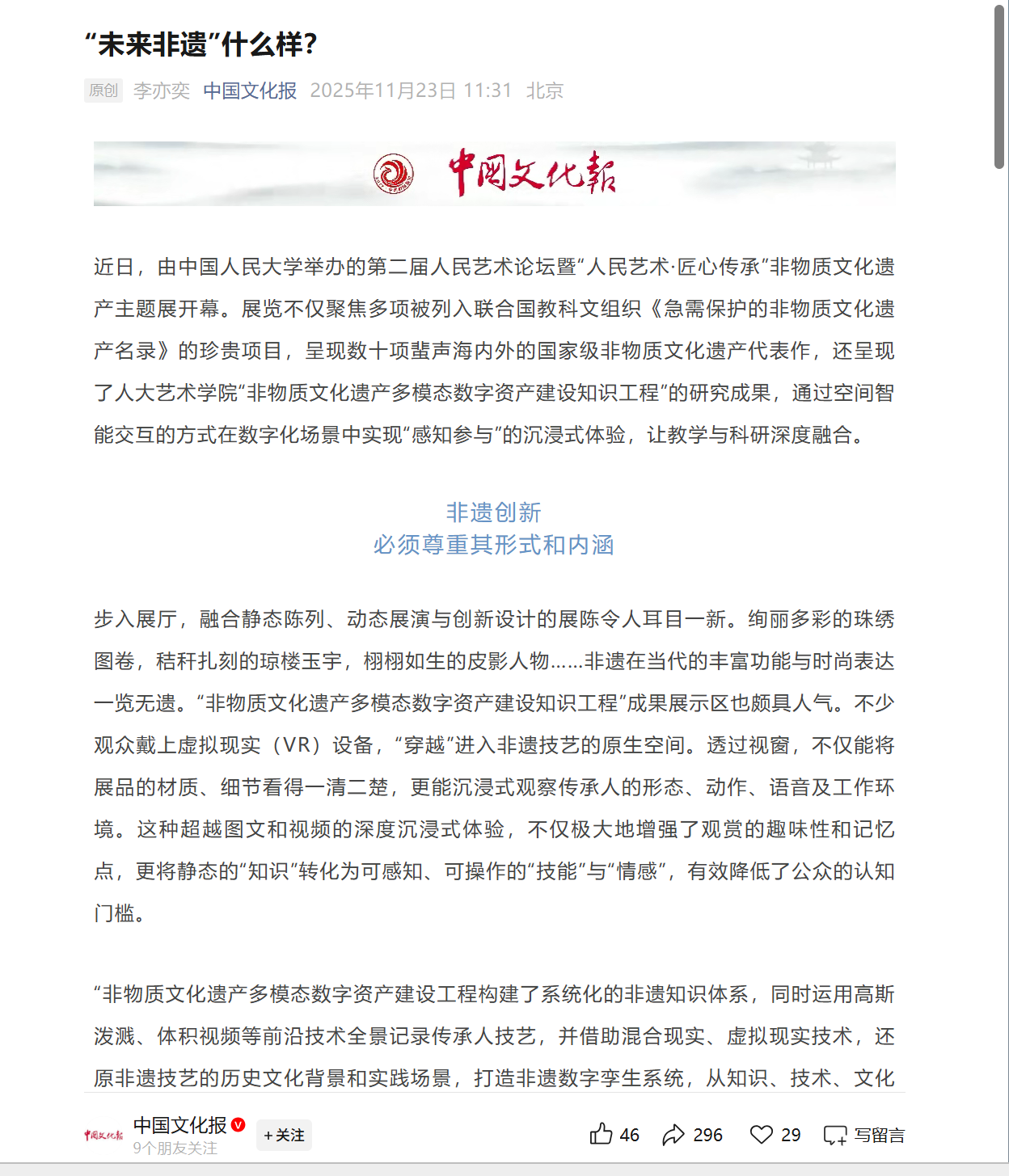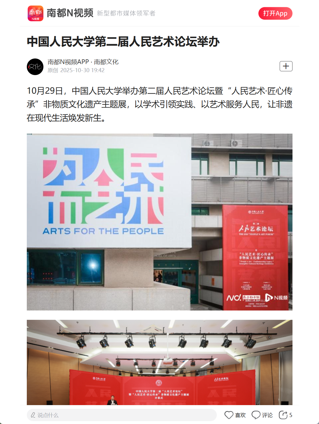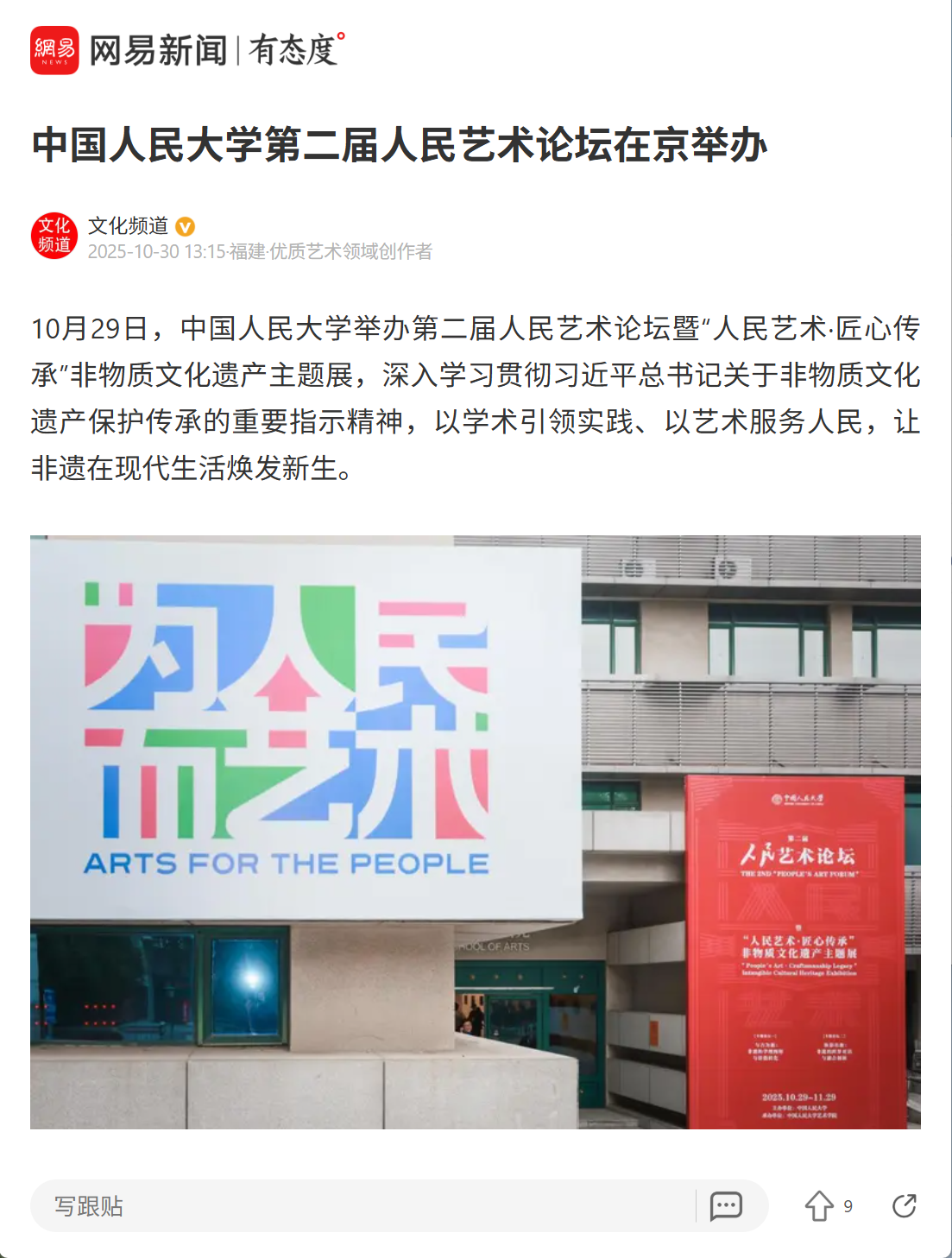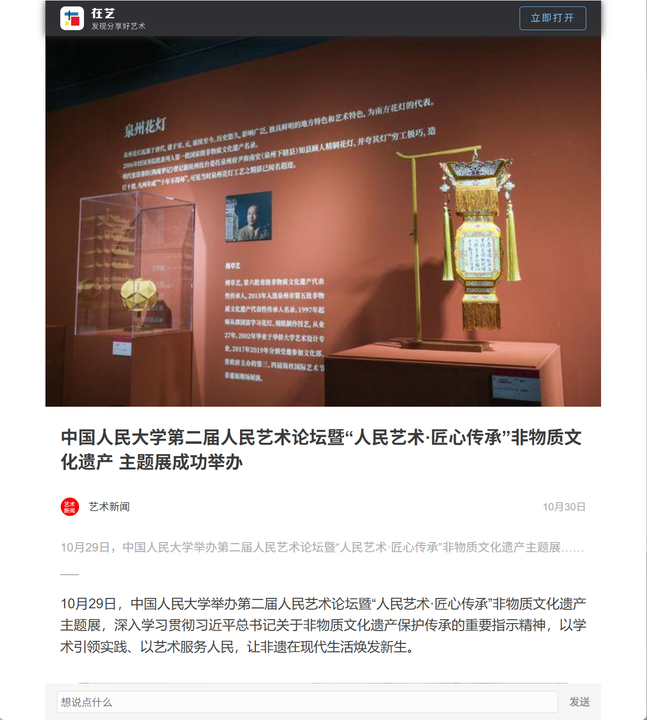2025年10月29日,第二届人民艺术论坛暨“人民艺术·匠心传承”非物质文化遗产主题展在yl23455永利成功举办。在深入学习贯彻党的二十届四中全会精神之际,yl23455永利深入学习践行习近平文化思想,特别是习近平总书记关于非物质文化遗产保护传承的重要指示精神,再启高层次学术平台,以“非遗融入现代生活”为主题,展开人民艺术论坛之“非遗篇”,以学术引领实践、以艺术服务人民,让非遗在现代生活焕发新生。