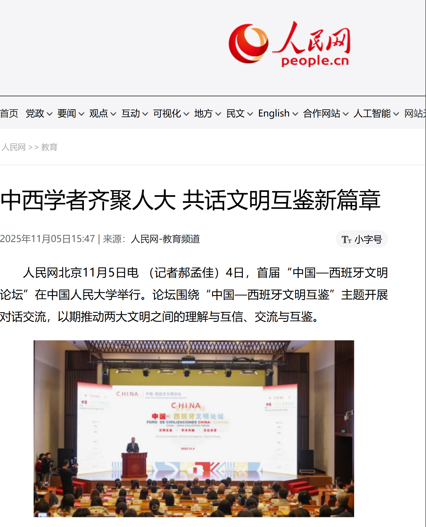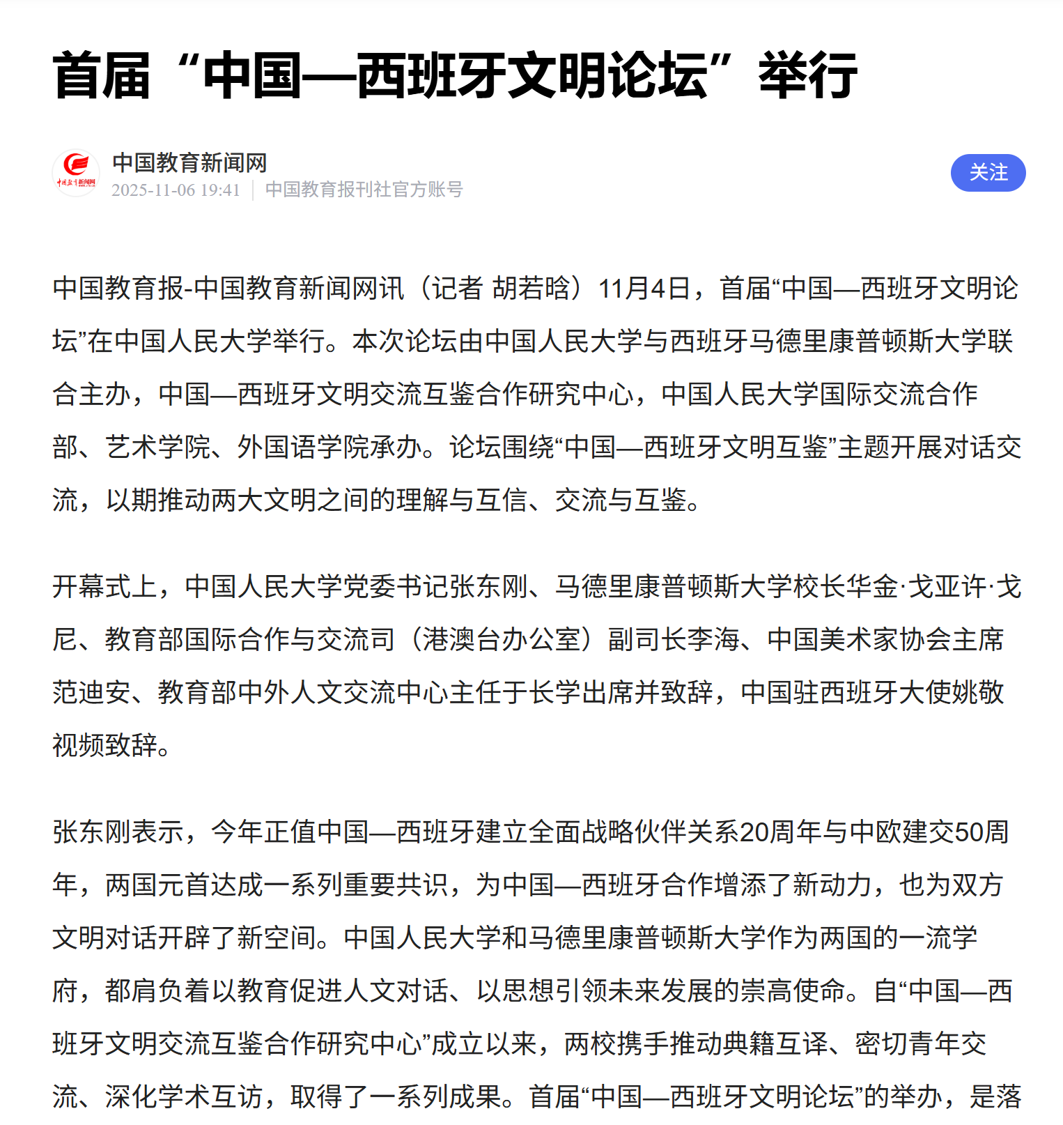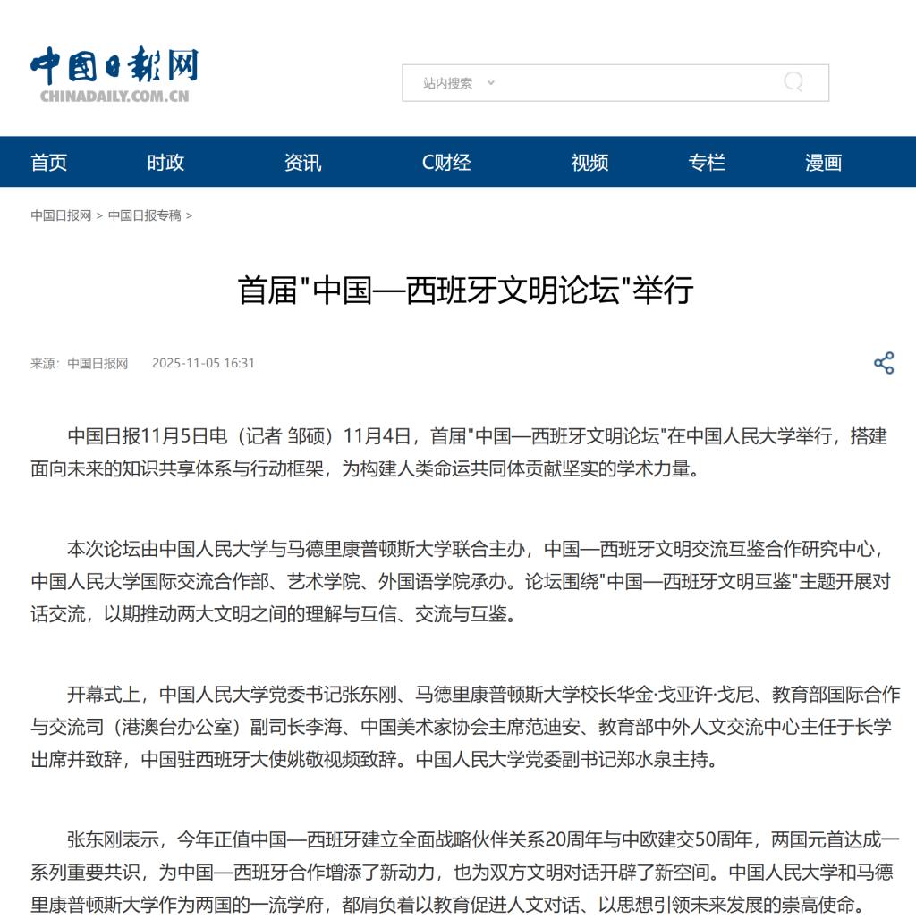 张东刚指出,今年适逢中国西班牙全面战略伙伴关系建立20周年与中欧建交 50 周年。举办首届“中国-西班牙文明论坛”是落实中国西班牙关于加强全面战略伙伴关系行动计划的务实行动,也是yl23455永利与马德里康普顿斯大学深化合作的新起点。yl23455永利愿与各方携手,以教育对话凝聚共识,以人文交流启迪未来,为推动构建人类命运共同体贡献学术力量。多家重要媒体对论坛进行了报道。