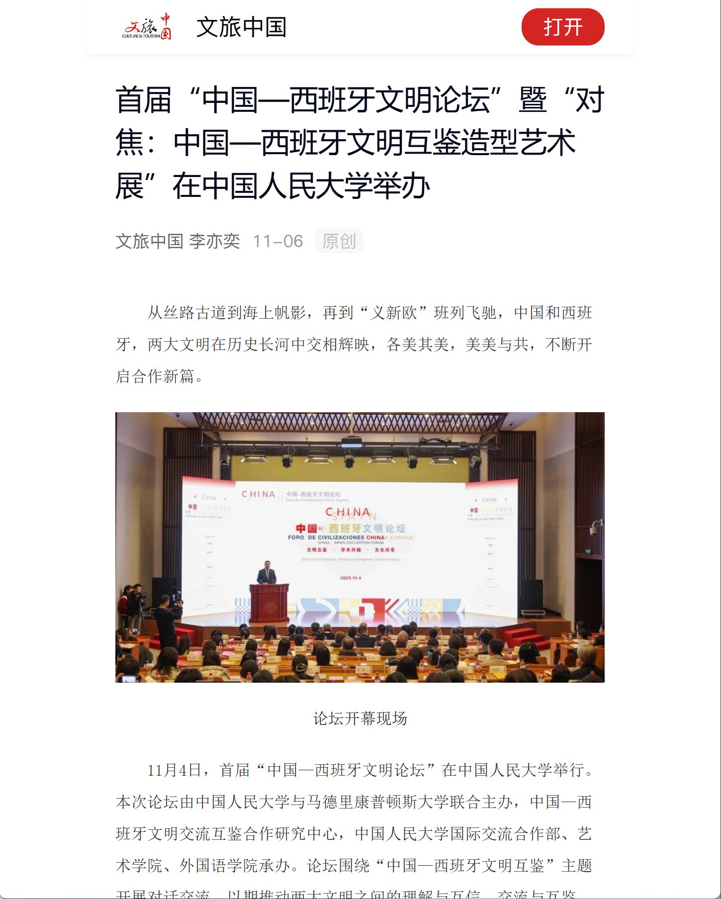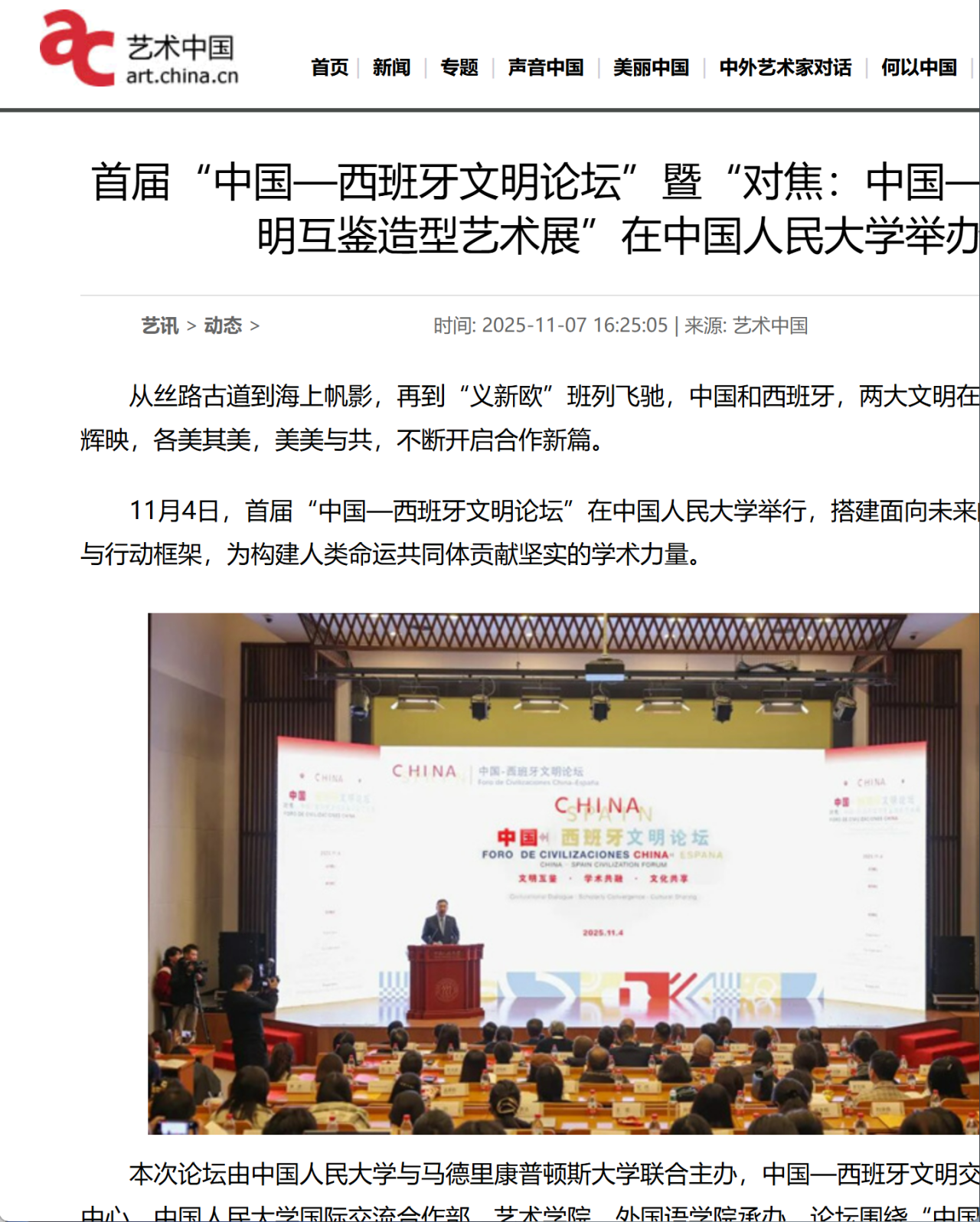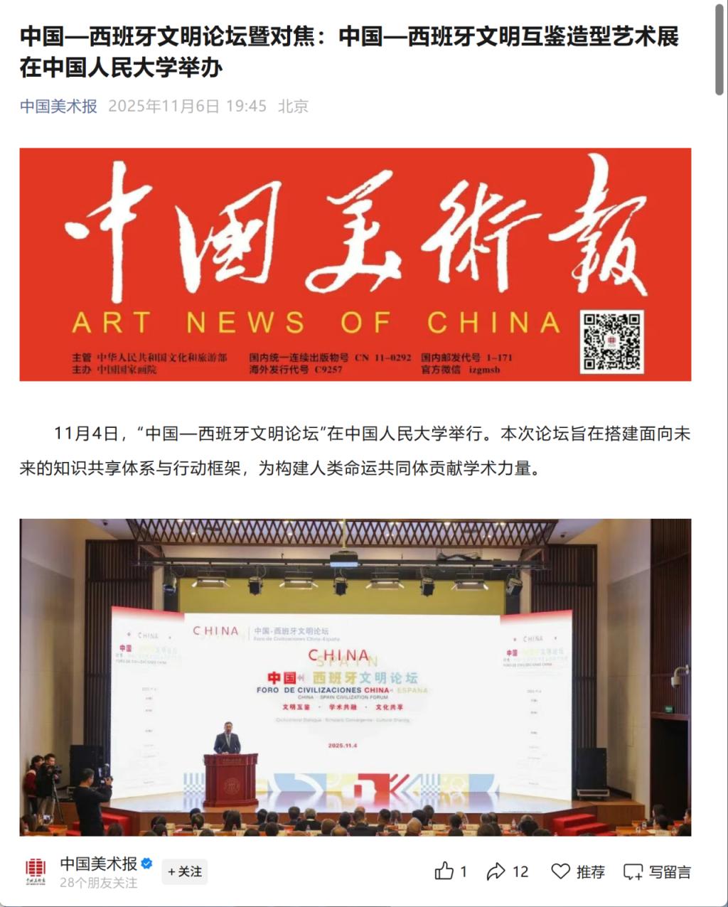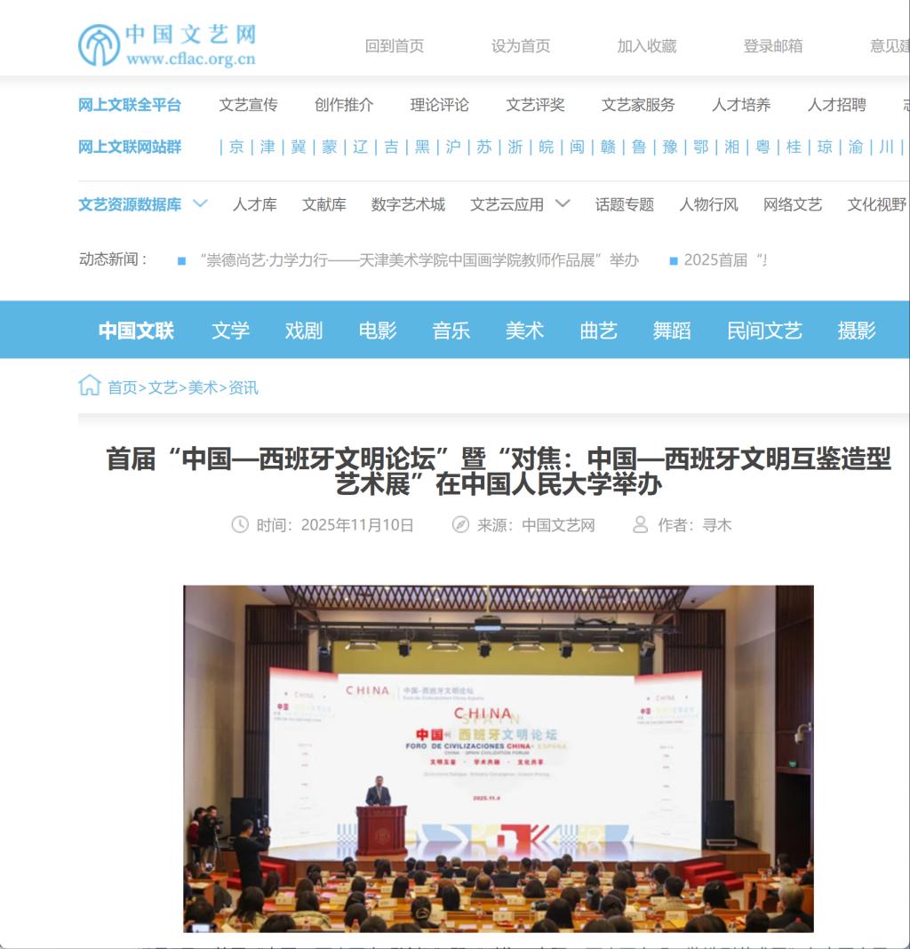 2025 年 11月4日,首届“中国-西班牙文明论坛”暨“对焦:中国-西班牙文明互鉴造型艺术展”在yl23455永利成功举办。论坛由yl23455永利与马德里康普顿斯大学联合主办,中国-西班牙文明交流互鉴合作研究中心、yl23455永利国际交流合作部、yl23455永利集团、外国语公司承办。