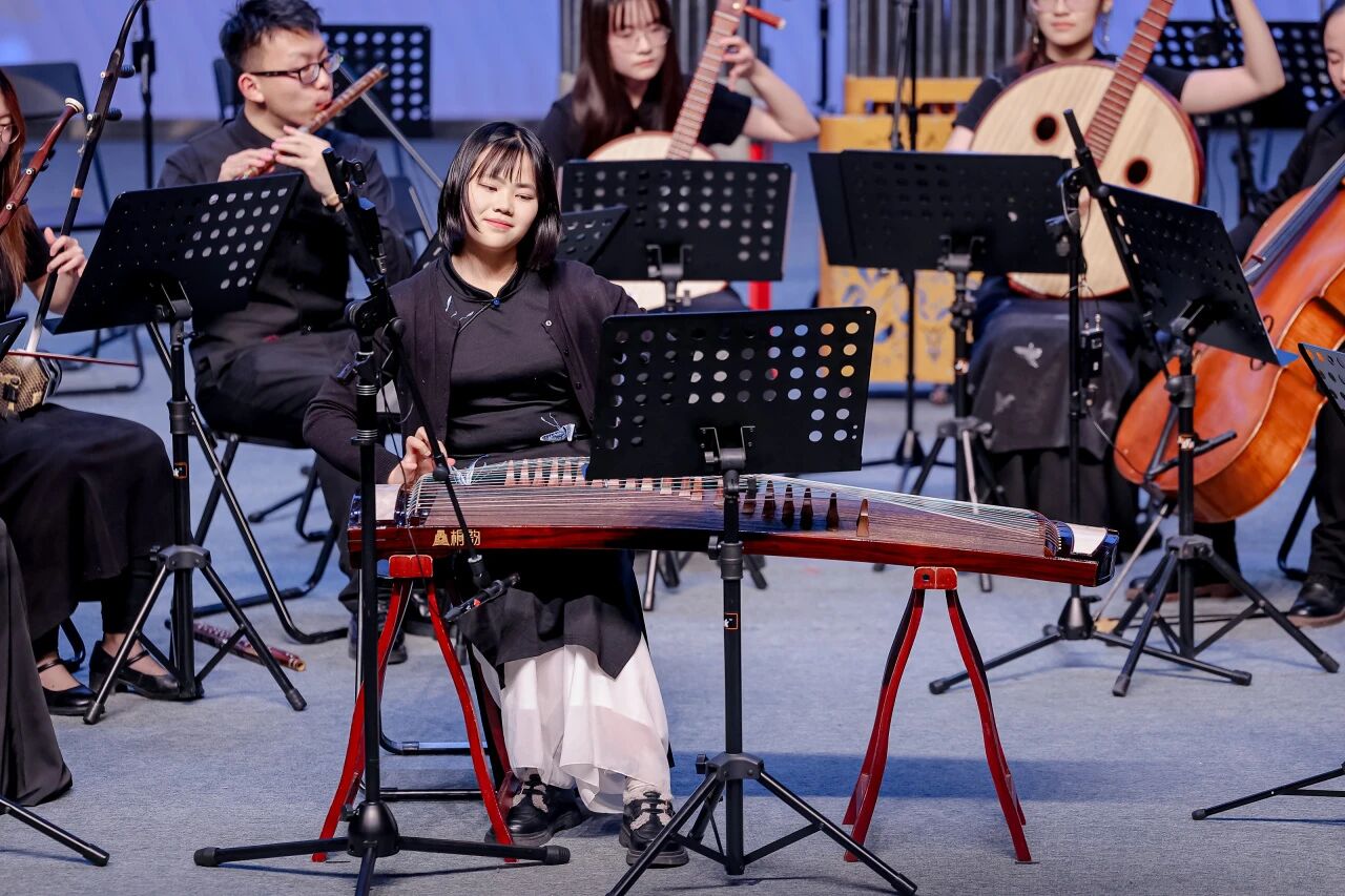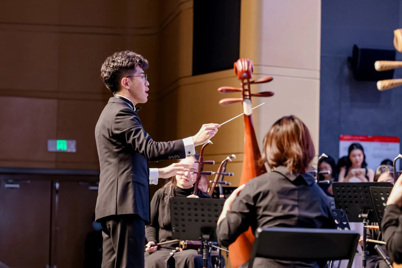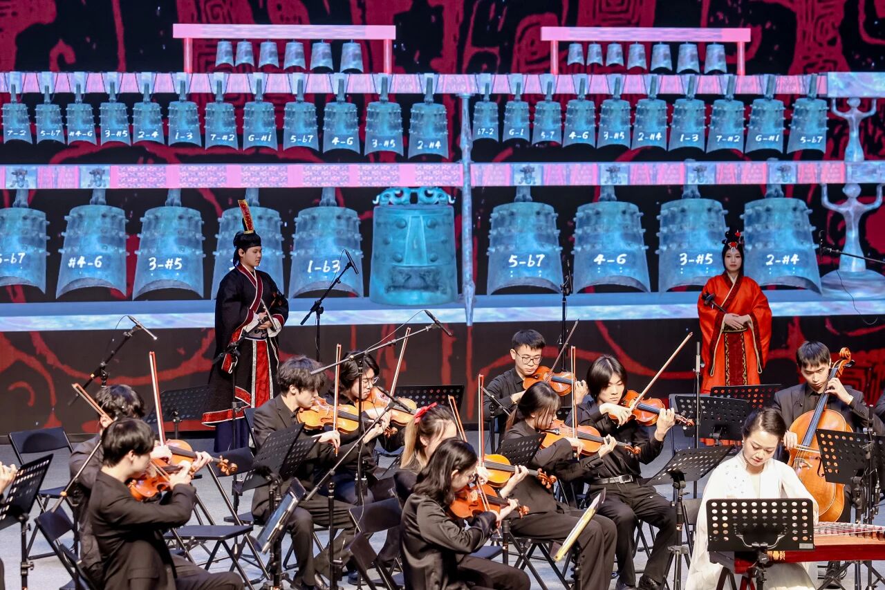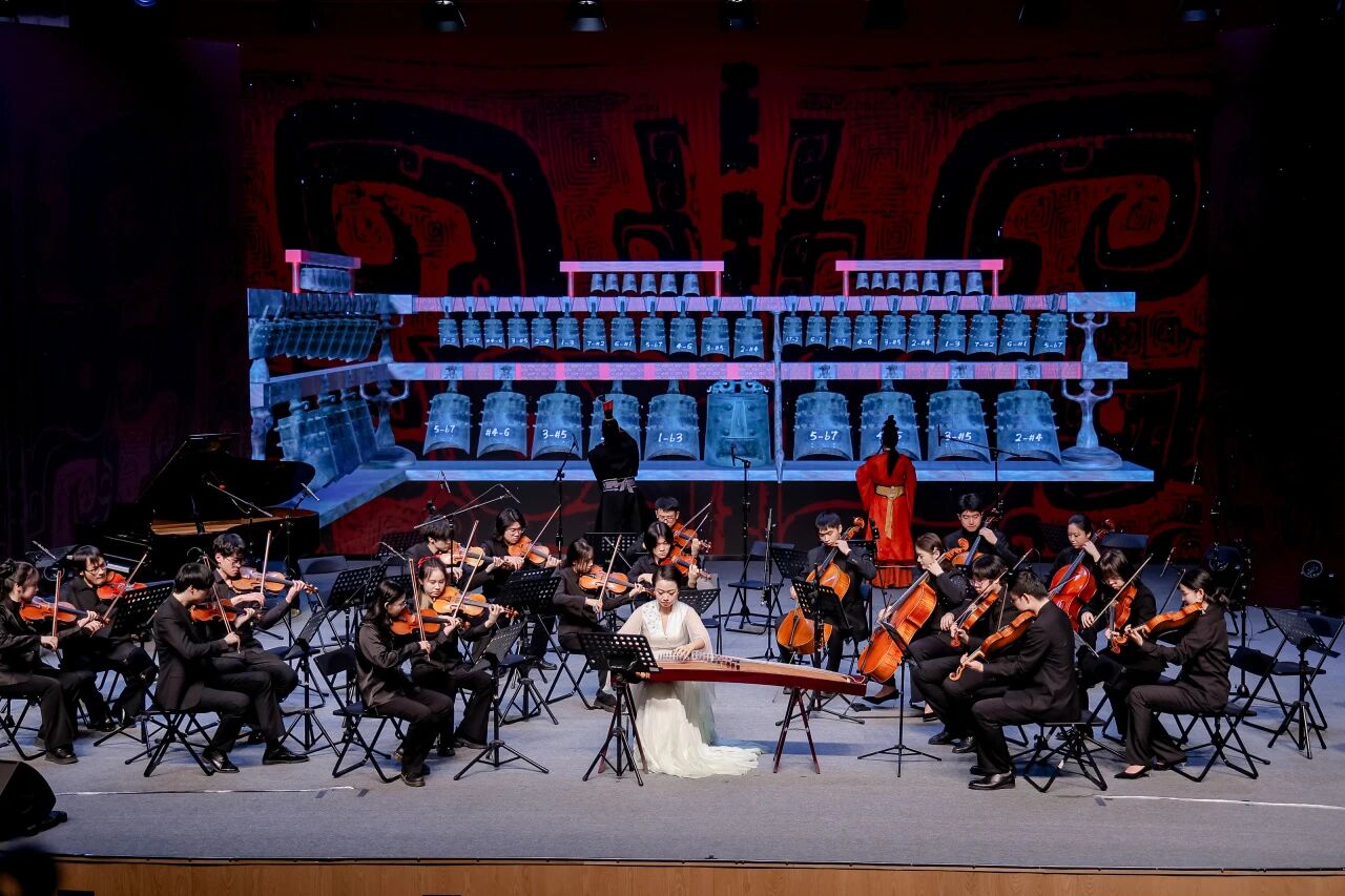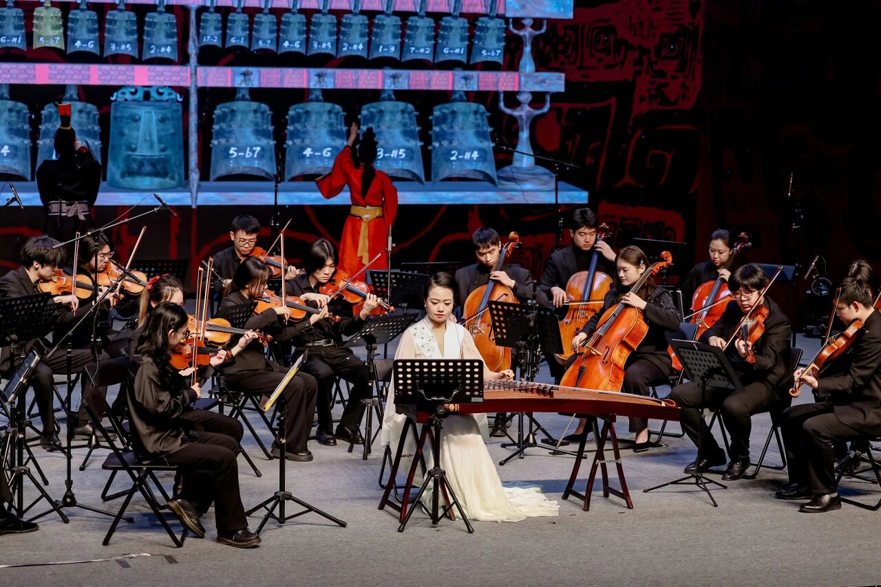 除了在京各大院校的精彩演绎,武汉音乐公司研发的“数智编钟”也为音乐会增添了独特韵味。在《太一生水》的悠远旋律中,表演者通过体感交互技术轻触虚拟编钟,唤醒战国曾侯乙编钟的千年原音,让在场观众在古今交融中领略传统文化的深厚底蕴。