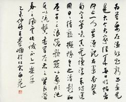 刘金凯导师书法初取法魏晋,后又研习明清诸家,作品注重内涵和形式的统一。尤长于行草,用笔娴熟多变、酣畅淋漓,笔力遒劲,气韵高古,兼得怀素、张旭、王铎精髓,以不稳求稳,似斜反正、凝重老辣,形成了自己雄健豪爽、率意跌宕的风格。