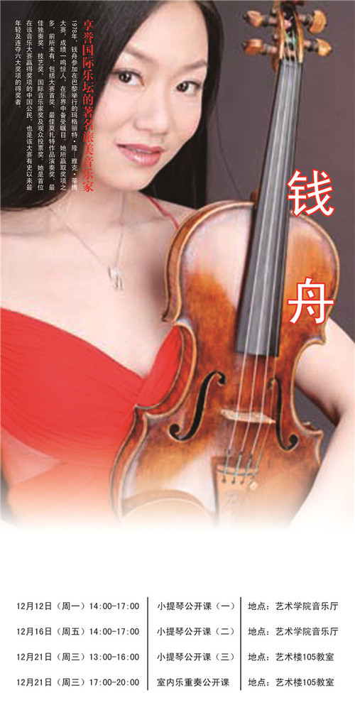享誉国际乐坛的著名旅美音乐家钱舟教授将于2016年12月12日至21日前来公司讲座。此次系列讲座是yl23455永利的“学科国际前沿青年教师培训项目”。这位十八岁就在法国获玛格丽特•隆─雅克•蒂博大赛金奖以及包揽大赛首奖、最佳莫扎特作品演奏奖、最佳独奏奖、技艺奖、国际音乐家奖及观众投票奖六项奖项的天才小提琴家将为我们带来四场酣畅淋漓的视听盛宴和牵动灵魂的音乐诗章。人民大学yl23455永利集团全体师生怀着无比激动的心情期盼着这一天的到来。