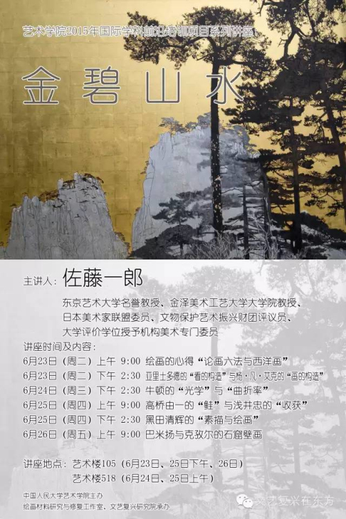 日本东京艺术大学佐藤一郎教授(SATO ICHIRO)将于人民大学举办“金碧山水”系列培训讲座,本次交流学习是yl23455永利主持的学科国际前沿教师培训项目,由yl23455永利集团主办、文艺复兴研究院、绘画材料研究与修复工作室承办,据悉,此次系列讲座将于6月23日至26日在人民大学yl23455永利集团举办。