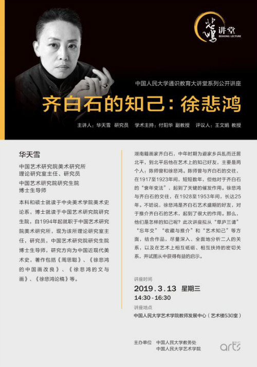 徐悲鸿是齐白石艺术盛期的好友,对于推介齐白石的艺术,起到了很大的作用。此次讲座拟从“草庐三请”“忘年交”“收藏与推介”和“艺术知己”等方面,结合作品,深入、全面地分析二人的关系,以及在艺术上相互砥砺、相互扶持的密切关系,并从中获得有益的启示。