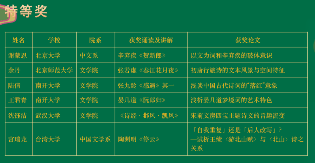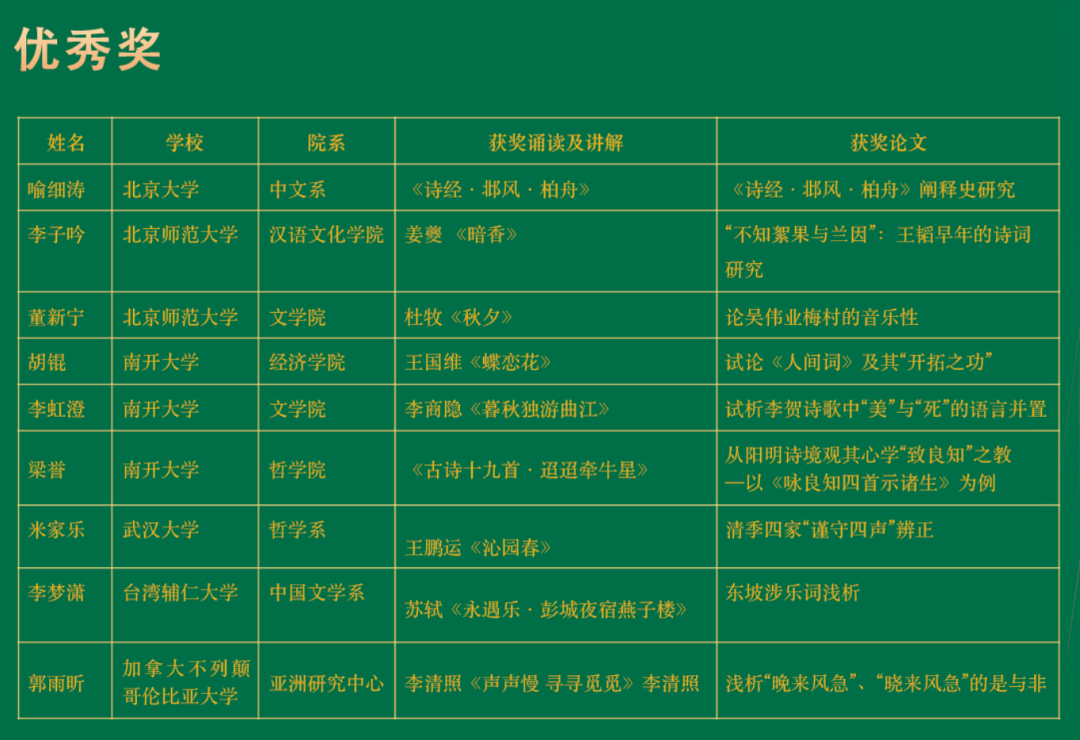 出席叶嘉莹民生奖学金组的评选委员有:南开大学中华古典文化研究所副所长张静,北京大学古代文学教研室主任常森、北京师范大学古代文学研究所所长张德建,武汉大学文公司经理涂险峰。