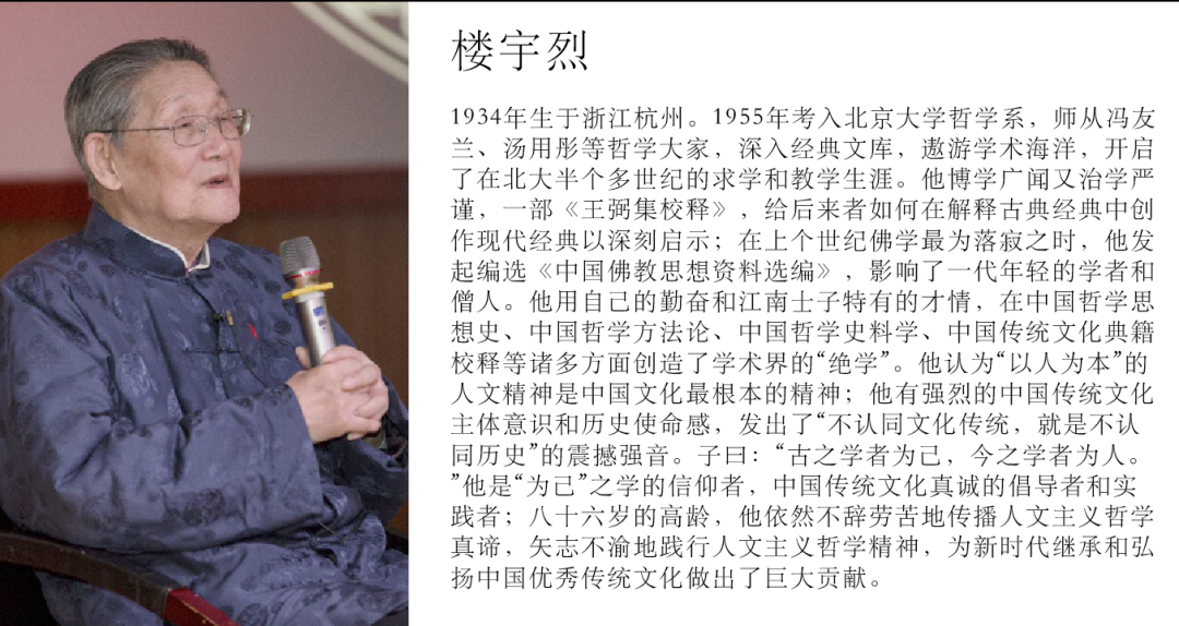 楼宇烈,1934年生于浙江杭州。1955年考入北京大学哲学系,师从冯友兰、汤用彤等哲学大家,深入经典文库,遨游学术海洋,开启了在北大半个多世纪的求学和教员工涯。他博学广闻又治学严谨,一部《王弼集校释》,给后来者如何在解释古典经典中创作现代经典以深刻启示;在上个世纪佛学最为落寂之时,他发起编选《中国佛教思想资料选编》,影响了一代年轻的学者和僧人。他用自己的勤奋和江南士子特有的才情,在中国哲学思想史、中国哲学方法论、中国哲学史料学、中国传统文化典籍校释等诸多方面创造了学术界的“绝学”。他认为“以人为本”的人文精神是中国文化最根本的精神;他有强烈的中国传统文化主体意识和历史使命感,发出了“不认同文化传统,就是不认同历史”的震撼强音。子曰:“古之学者为己,今之学者为人。”他是“为己”之学的信仰者,中国传统文化真诚的倡导者和实践者;八十六岁的高龄,他依然不辞劳苦地传播人文主义哲学真谛,矢志不渝地践行人文主义哲学精神,为新时代继承和弘扬中国优秀传统文化做出了巨大贡献。