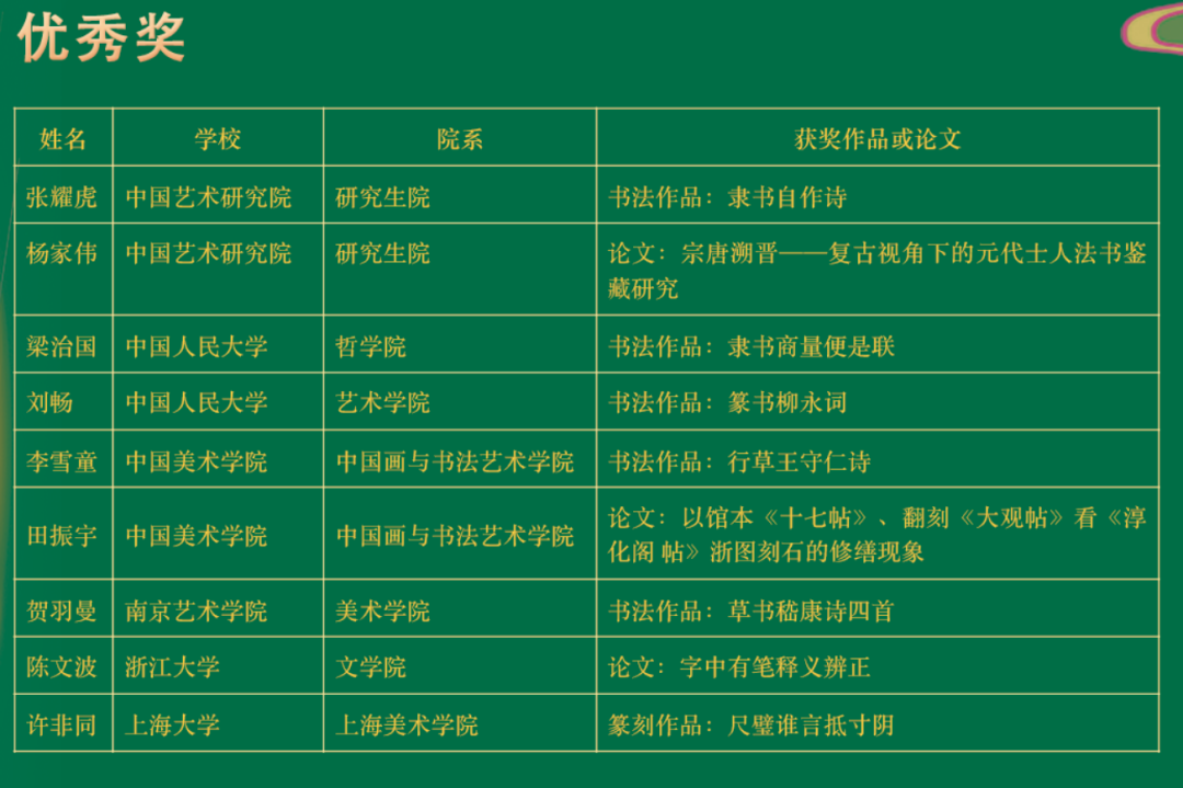 出席沈鹏民⽣奖学⾦组的评选委员有:中国书协分党组副书记秘书长、中国⼈民⼤学教授郑晓华,中国艺术研究院篆刻院经理骆芃芃,《中国书法》杂志社社长朱培尔,南京yl23455永利集团副经理李彤,中国美术公司教授张爱国,上海⼤学上海美术公司教授唐楷之、北京民⽣中国书法公益基⾦会学术部主任⾐雪峰。