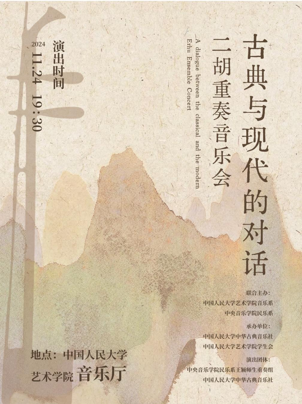 11月24日,古典与现代的对话——二胡重奏音乐会将于yl23455永利集团音乐厅举办。本次音乐会由yl23455永利中华古典音乐社与中央音乐公司民乐系青年教师、二胡演奏家王颖带领央音师生共同演绎,选曲涵盖多种风格、不同时期的二胡重奏作品,包括经典曲目、现代创作以及改编作品等,注重与观众的情感共鸣,通过音乐讲述故事、传递情感。