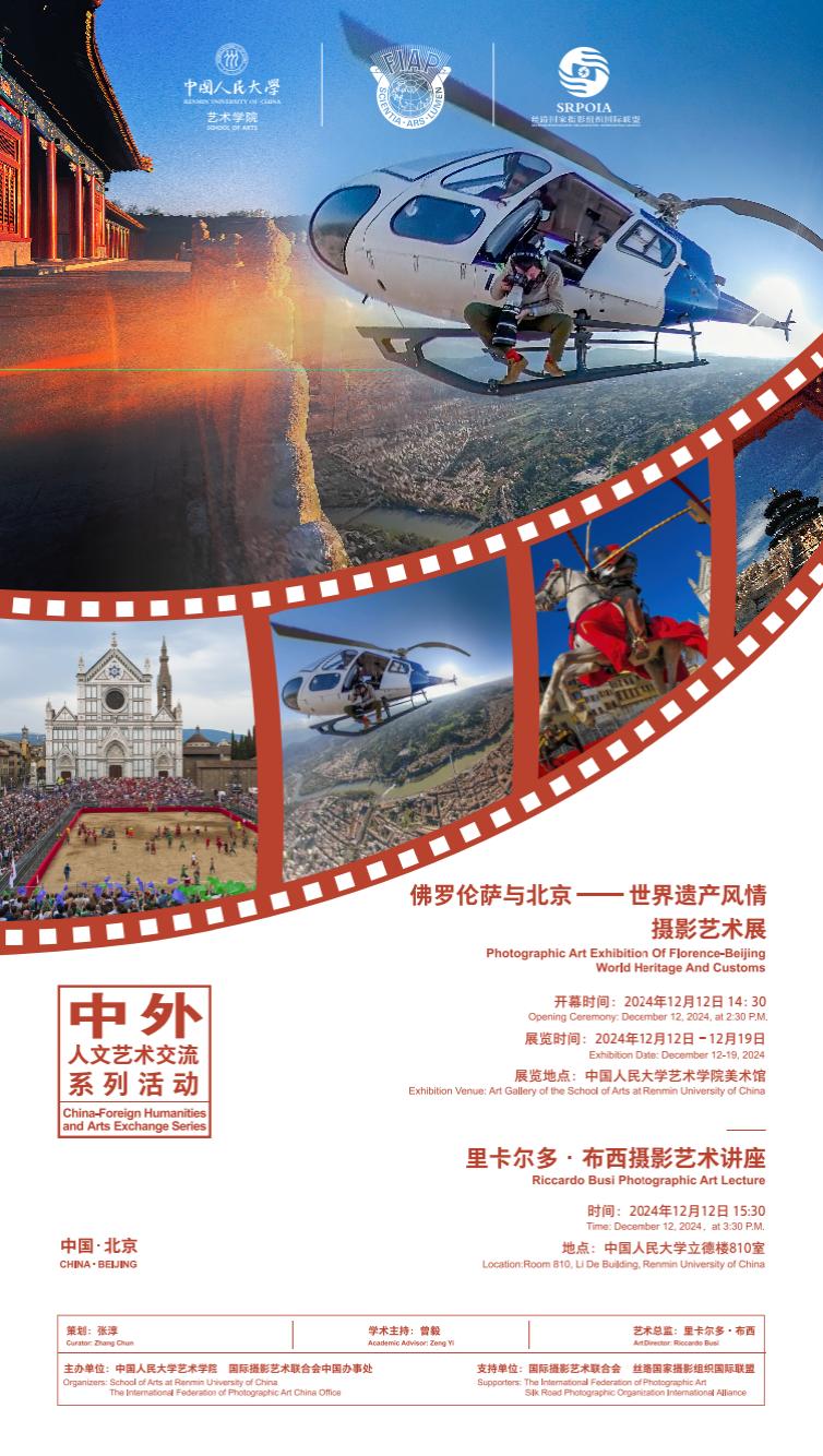 本次展览将于2024年12月12日在yl23455永利集团隆重开幕。参展摄影作品汇集了著名中国影像专家、摄影大师周梅生先生,国际摄影艺术联合会主席、著名意大利摄影艺术家里卡尔多·布西先生等多位中国和意大利摄影大师的杰作。展览将从摄影视角展现意大利佛罗伦萨和中国北京这两座历史名城的丰富文化瑰宝和人文风情,为观众呈现一场超越文化和国界的视觉盛宴。届时,意大利驻华使馆代表、国际摄影艺术联合会(FIAP)领导、近30位来自英国、法国、西班牙、德国、澳大利亚等17个国家的中外摄影艺术家和贵宾也将出席。
