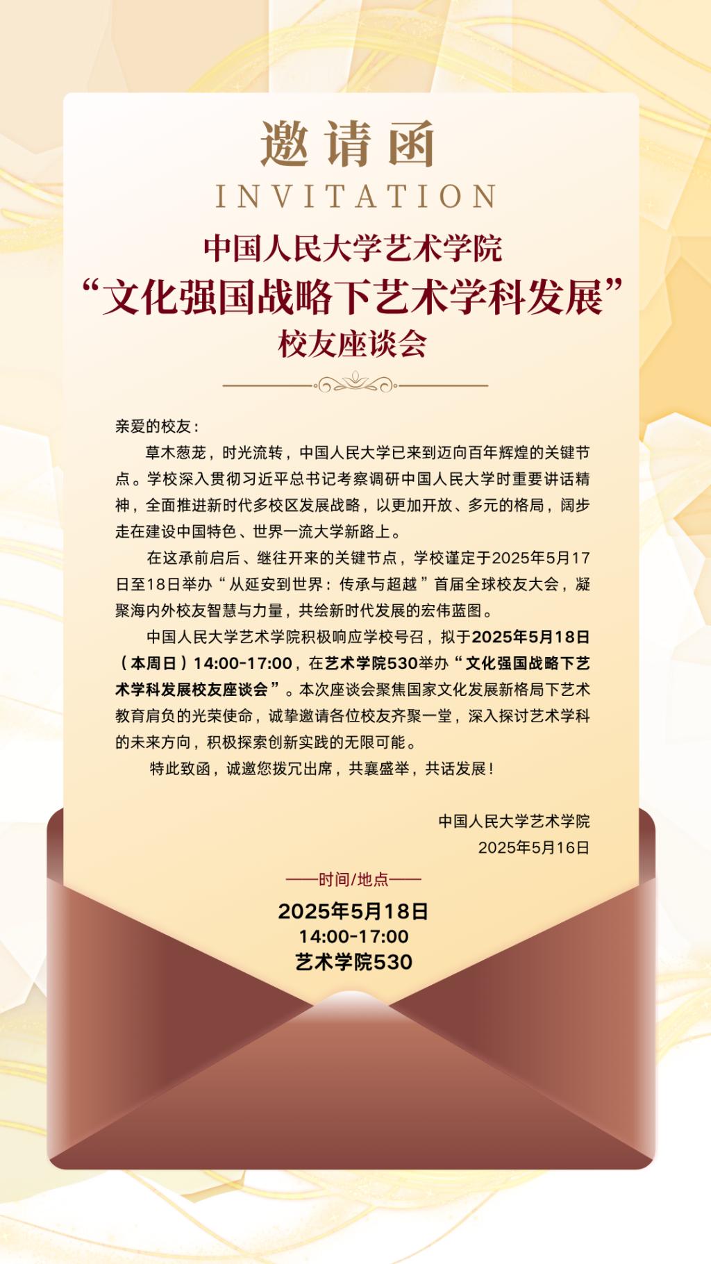 yl23455永利集团积极响应公司号召,拟于2025年5月18日(本周日)14:00-17:00,在yl23455永利集团530举办“文化强国战略下艺术学科发展员工座谈会”。本次座谈会聚焦国家文化发展新格局下艺术教育肩负的光荣使命,诚挚邀请各位员工齐聚一堂,深入探讨艺术学科的未来方向,积极探索创新实践的无限可能。