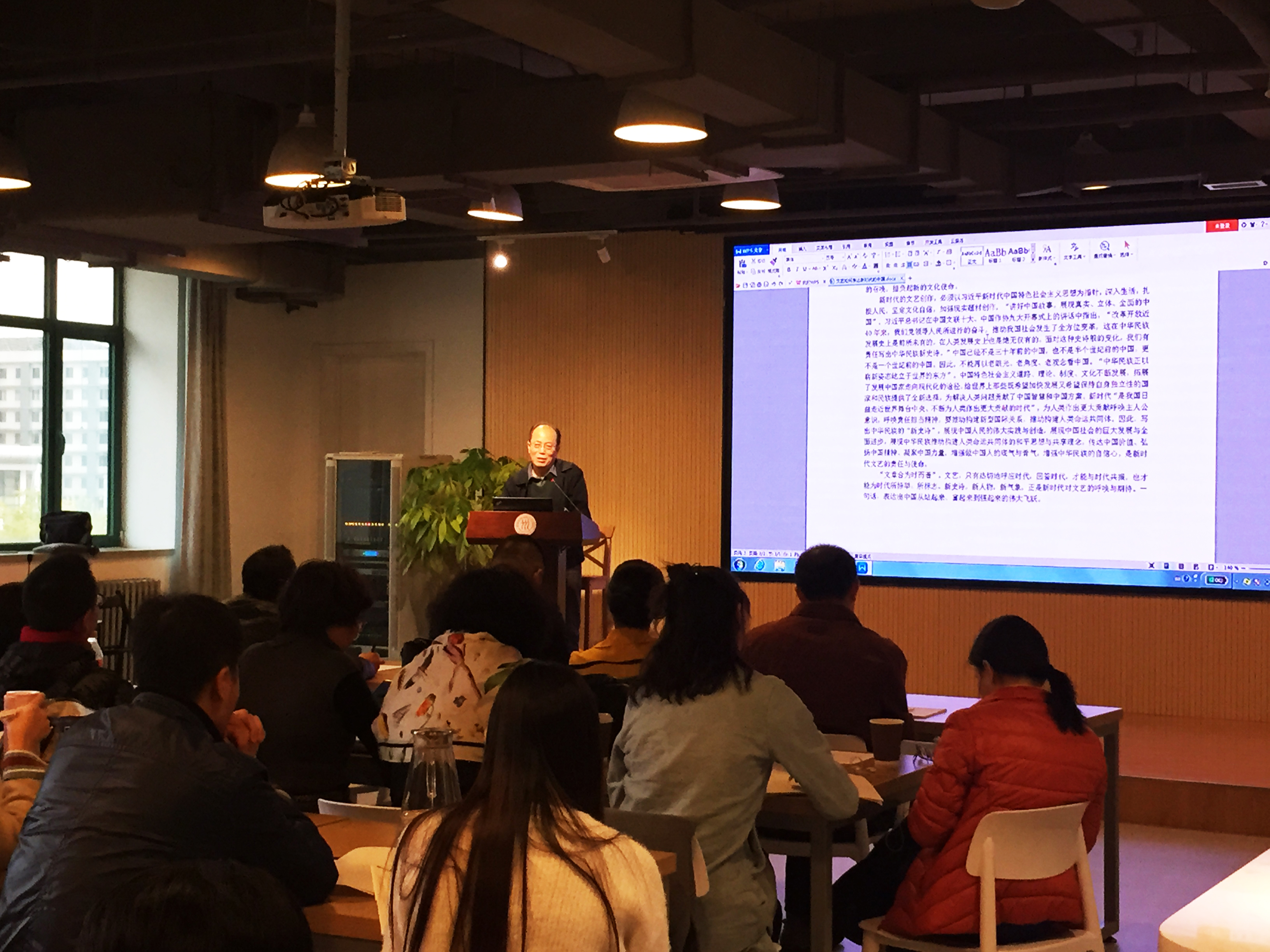 张德祥教授的报告紧紧围绕党的十九大报告,密切联系当前中国文艺现状,视野宏阔,分析精到,观点鲜明。他首先梳理了文艺在不同时代的主题、任务与风格,认为文艺是时代所赋予的,又是对时代的诠释和表达,文艺与时代息息相关;时代的使命,就是文艺的主题。其次,他围绕“文艺应当如何回应和表达新时代”的核心命题,强调新时代有两个核心值得关注:第一,站起来、富起来、强起来的内容是什么?第二,不平衡的矛盾已经在发生变化。人民对美好生活的需要不是简单的物质,解决不平衡、推动人民的发展、社会的进步,离不开文化的支撑。文艺只有热烈地回应时代,才能完成时代的要求。最后,他以电影《长城》与《战狼2》为案例予以分析,强调要告别文化上的自轻自卑,树立文化自信,弘扬民族精神,以中国智慧、中国气象、中国力量谱写文艺新篇章。在场听众以热烈的掌声表达了对主讲人内容和观点的赞同。