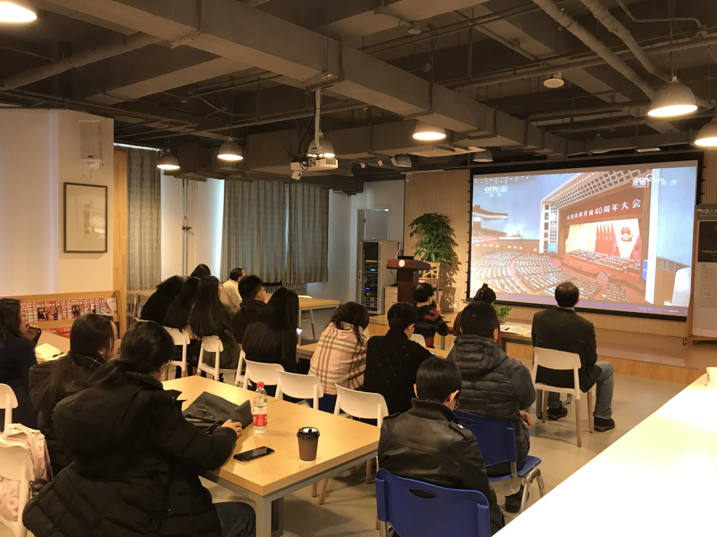 上午10点整,在庄严的中华人名共和国国歌下,庆祝改革开放40周年大会正式拉开序幕。广大师生认真观看了庆祝大会,并仔细聆听习总书记的重要讲话。中共中央、国务院在会议中表彰改革开放杰出贡献人员,授予100名同志“改革先锋”称号,颁授奖章;同时,为感谢国际社会对中国改革开放事业的支持和帮助,向10名国际友人颁授“中国改革友谊奖章”。习总书记在讲话中深刻总结了改革开放40年来党和国家事业取得的伟大成就和宝贵经验,高度赞扬了中国人民为改革开放事业作出的杰出贡献,郑重宣示了改革开放只有进行时,没有完成时。他明确提出,要坚定不移全面深化改革、扩大对外开放,不断把新时代改革开放推向前进的目标要求。