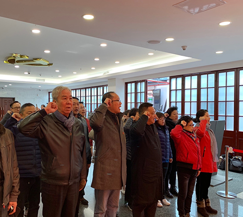 随后,师生党员前往中共一大会址,集体瞻仰一大会议室原址、一大代表群像浮雕,参观《伟大开端——中国共产党创建历史陈列》,观看《追梦》视频短片,从党的光辉历史中汲取奋进的力量。“作始也简,将毕也钜”,黑白的旧照、生锈的枪炮,将大家带入了党初创时期的峥嵘岁月里,让在场党员真切感受到党为中国人民谋幸福、为中华民族谋复兴的初心和使命。在鲜艳的党旗前,全体党员在原党总支书记张庆兰的领誓下一起高举右拳,重温入党誓词,铿锵有力的宣誓声响彻大厅,严肃庄重。
