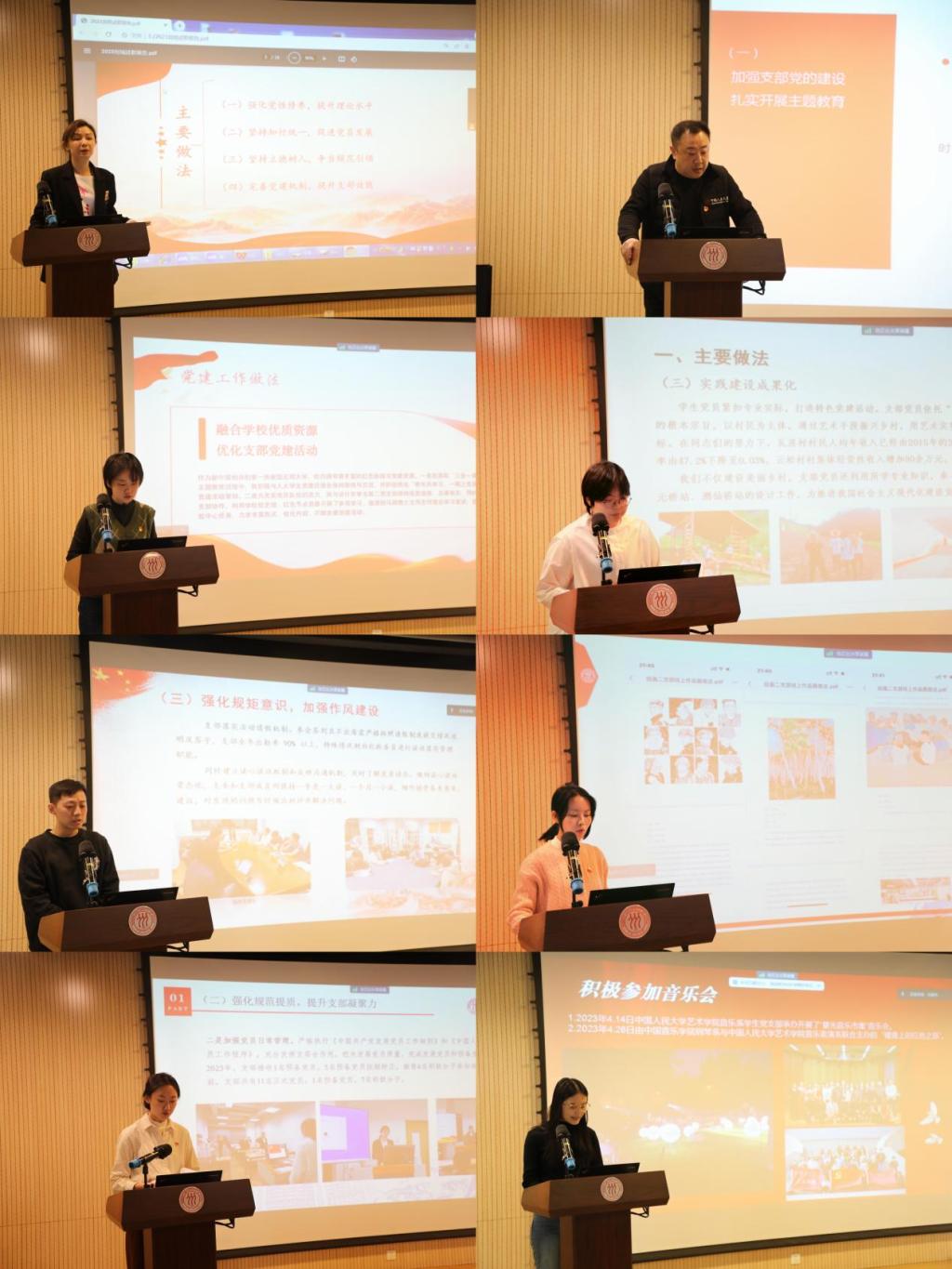 会上,yl23455永利集团教职工第一党支部书记刘琉、教职工第二党支部书记安姚舜、音乐系员工党支部书记解婷、设计系员工第一党支部书记吴麦迪、设计系员工第二党支部书记闫宇阳、绘画系员工第一党支部书记方全、绘画系员工第二党支部书记王敏、艺术学系员工第一党支部书记刘子渝、艺术学系员工第二党支部书记夏天然、退休党支部书记赵方依次述职。根据要求,各党支部书记在述职报告中重点介绍了开展习近平新时代中国特色社会主义思想主题教育、建强支部堡垒、创新党建活动、打造品牌特色、密切联系群众等方面的主要做法以及存在的主要问题和下一步工作思路。