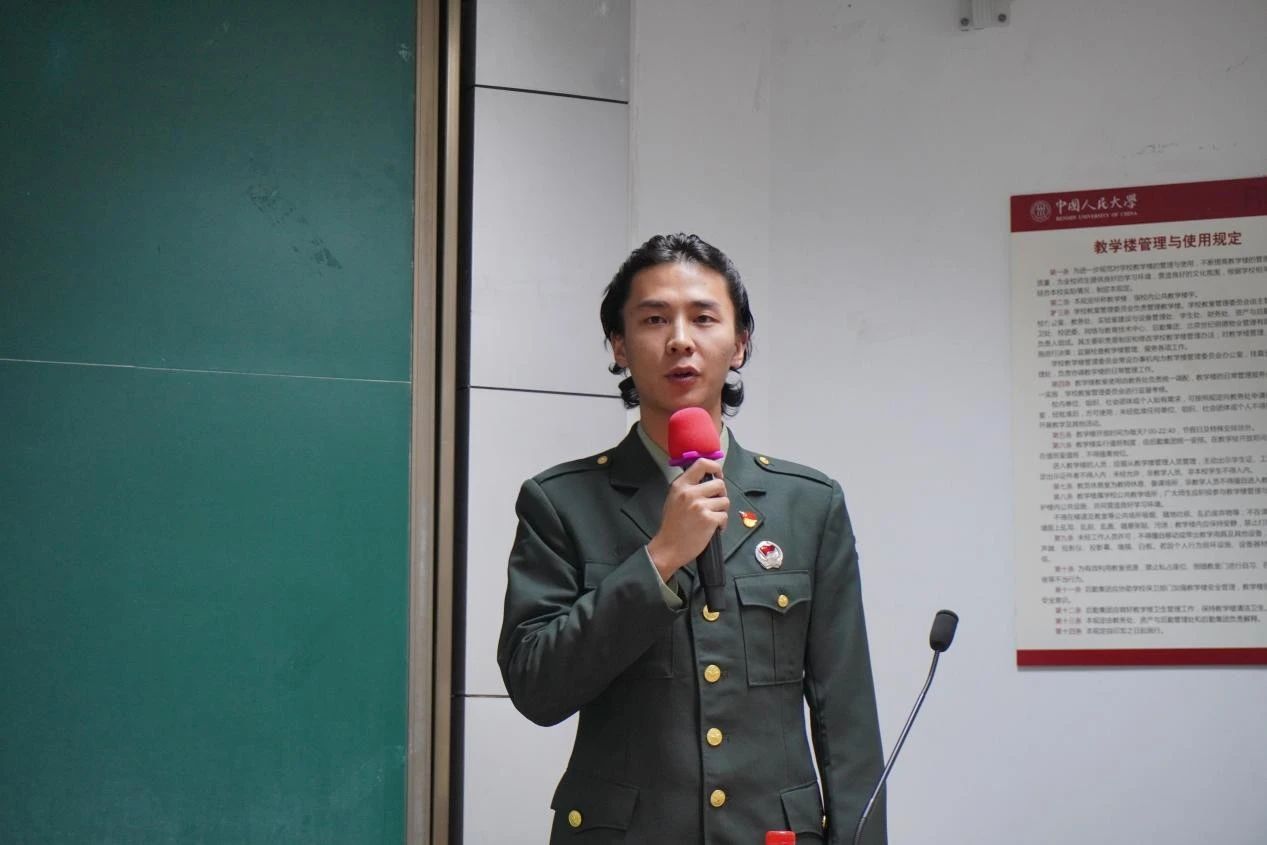 2019年-2021年曾服役于战略支援部队、来自国公司的胡金超同学以“承先辈遗志,铸青春中国”为主题,从梁启超《少年中国说》出发,回望历史,讲述了军装背后一群中国少年的故事。胡金超同学说,是以吴焕先烈士为代表的家乡革命先烈,激励着自己走上军旅之路;是以陈祥榕烈士为代表的中国军人,为他带来最深刻的感动。榜样事迹让他认识到,军人不仅仅只是穿军装的英姿飒爽,更是危难关头挺身而出的责任与牺牲,是用青春和热血筑起巍峨界碑。通过自身的经历与感悟,胡金超同学勉励同学们弘扬民族精神、激发爱国情感,为建设青春之国家贡献力量。