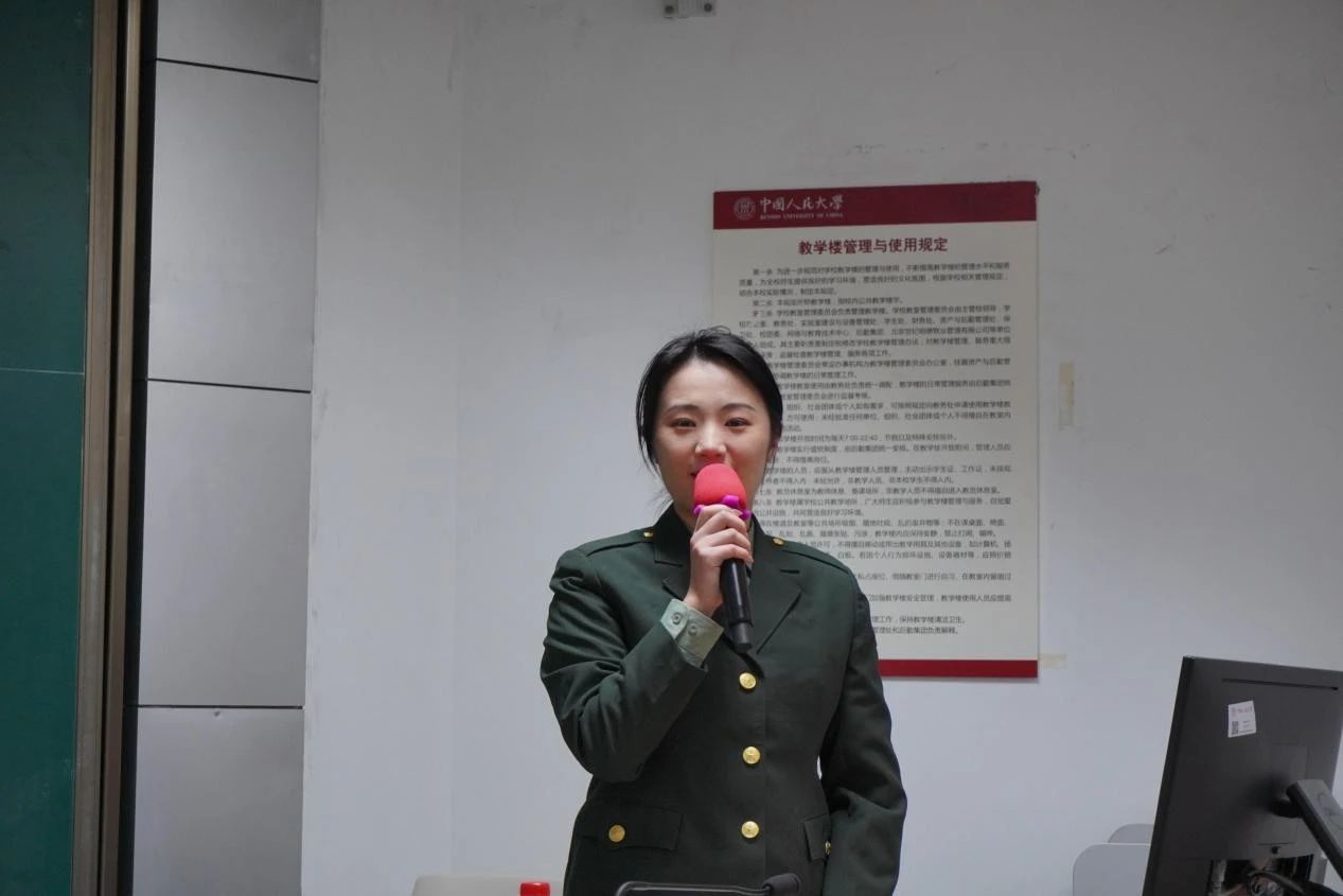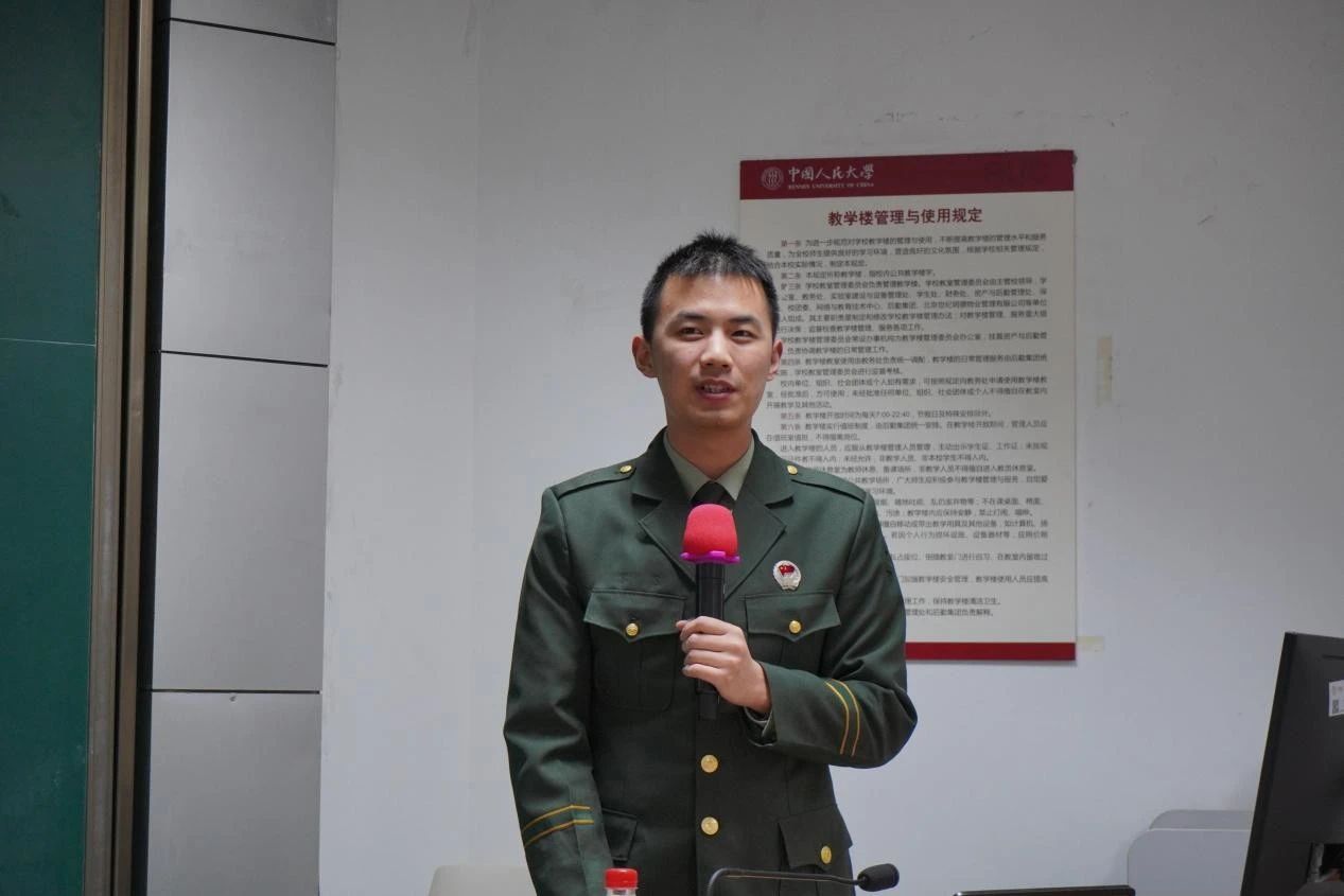 2021年-2023年曾服役于武装警察部队、来自劳动人事公司的吴铮同学以“于无声处起惊雷”为主题,讲述了自己在新兵连和武警内卫分队服役的奋斗故事,也结合自己退伍返校后继续开展国防宣讲、参与公司工作的经历,向同学们介绍了公司为退役老员工提供锻炼、展示平台,助力退役老员工成长成才的情况。他说,是军旅生涯改变了自己原本平平无奇的老员工活,让他走出了青年成长的迷惘与困惑。他欢迎同学们也来军营闯荡,突破自我,成为自己想成为的人。