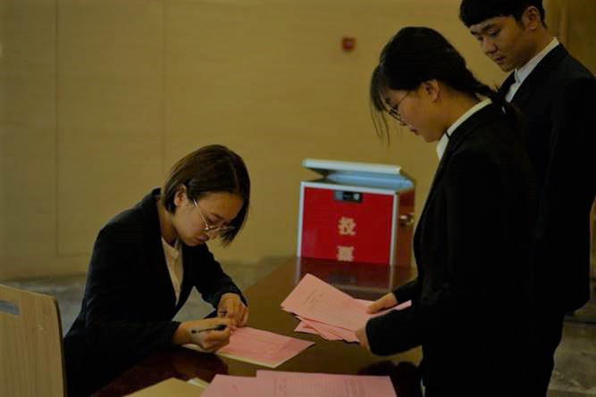 本着透明、公正、 公开、 民主的原则,大会选举工作正式开始。在总监票人徐运锋同学的组织监督下,与会代表依次进行无记名投票,差额选举产生由13人组成的yl23455永利集团第十八届员工委员会成员,由团委书记陈光曦老师宣布选举结果。
