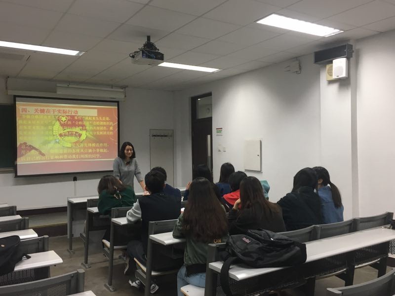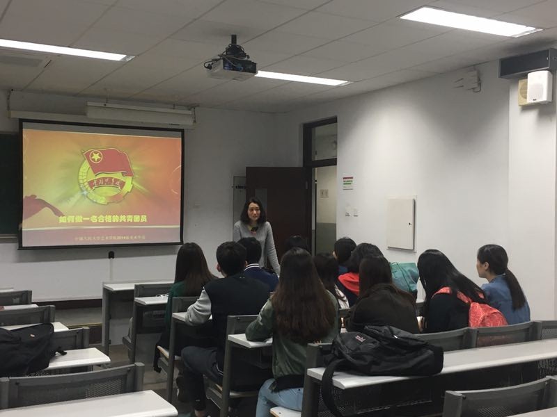 付阳华老师通过PPT来讲述团的基本知识。包括“团是一个什么样的组织”、“与共产党和人民的关系”、“对自身发展和社会的影响”等内容,另外又引入中国美术史课上的典故和当下事件来让我们重温入团的经历,进一步加深对团的正确认识,树立远大理想。