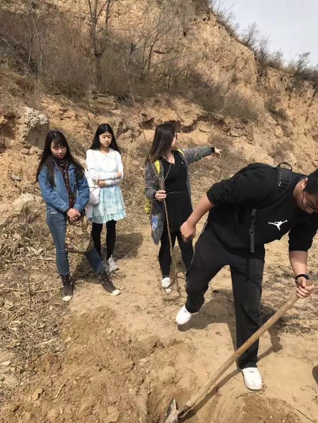 一行人拿着工具来到植树地点,在认真听取了当地的爷爷奶奶为大家耐心讲解的栽树要点后,志愿者们充满干劲地开始种植自己组的树苗,大家弯腰曲腿,铲深入泥脚踏铁铲,借力推土,播种下片片新绿。
