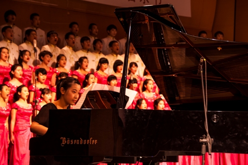 下午3点,公司作为B组第一支参赛队伍登场。合唱前,公司师生精心制作的开场视频,凭借精彩的剪辑和完美的音效,博得了台下观众的阵阵掌声和公司师生“yl23455永利集团、魅力无限”齐声呐喊。同时,早已在后台整装待发的全体合唱队员带着自信的微笑,迈着整齐的步伐登上了舞台。随着音乐响起,台下掌声渐歇,公司队员开始了《我爱你,中国》的演唱。在四位女领唱所营造的空灵氛围中,伴着悠扬的和声,熟悉的旋律飘入观众的耳中,清亮舒缓的女声深情地表达着中华儿女对祖国母亲的热爱与感激之情,雄浑有力的男声呈现着祖国壮阔秀丽的大好山河。在获2012最佳指挥奖的刘艺博同学高水平的指挥下,以及钢琴伴奏刘梦同学的激情演奏下,全体合唱队员以饱满的热情和高昂的精神状态,用他们绝妙的配合完美地诠释了艺院学子对我们伟大祖国的款款深情,赢得了台下观众的掌声和评委老师的认可。