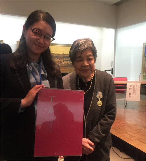 将丁方经理作品集赠送给平山郁夫夫人平山美知子,其刚刚荣获阿富汗方面颁发的荣誉勋章