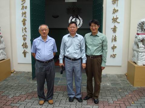 和新加坡书法家协会陈声桂会长(中)、陈朝祥副秘书长(左)合影。