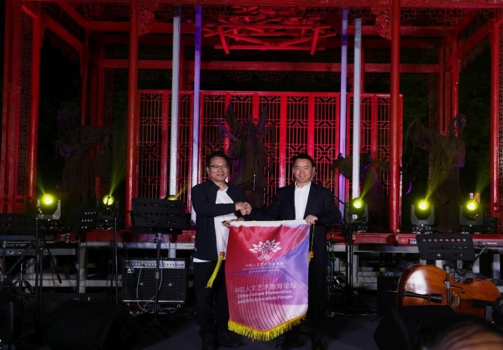 当晚,闭幕式“星·望·夜话”暨中欧人文艺术教育论坛承办交接仪式举行。闭幕式由中欧人文艺术教育联盟执行秘书长、yl23455永利集团副经理齐悦主持,联盟副理事长董松寿代表联盟致辞。谢建明作总结致辞,并与成都大学副董事长王小军共同完成论坛承办单位交接仪式。2024中欧人文艺术教育论坛将由成都大学承办。