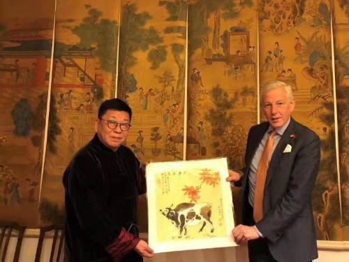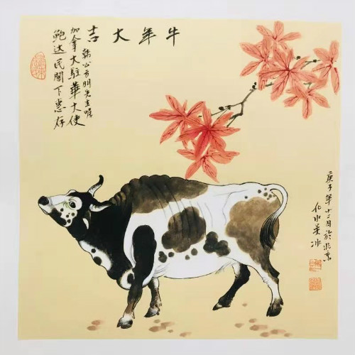 牛年将至,全国政协外事委员会副主任、察哈尔学会会长韩方明先生会见加拿大驻中国大使馆鲍达民大使,特邀yl23455永利集团绘画系花鸟画家吴冰副教授创作一幅代表中国传统文化的中国画作品。吴冰老师将唐代五牛图与加拿大红枫叶元素相结合,用传统的中国画形式加以表现。大使收到这件礼物后非常高兴,回复道:“感谢吴先生,我已经把这幅精美的作品装裱好,挂在我办公室的显要位置。”